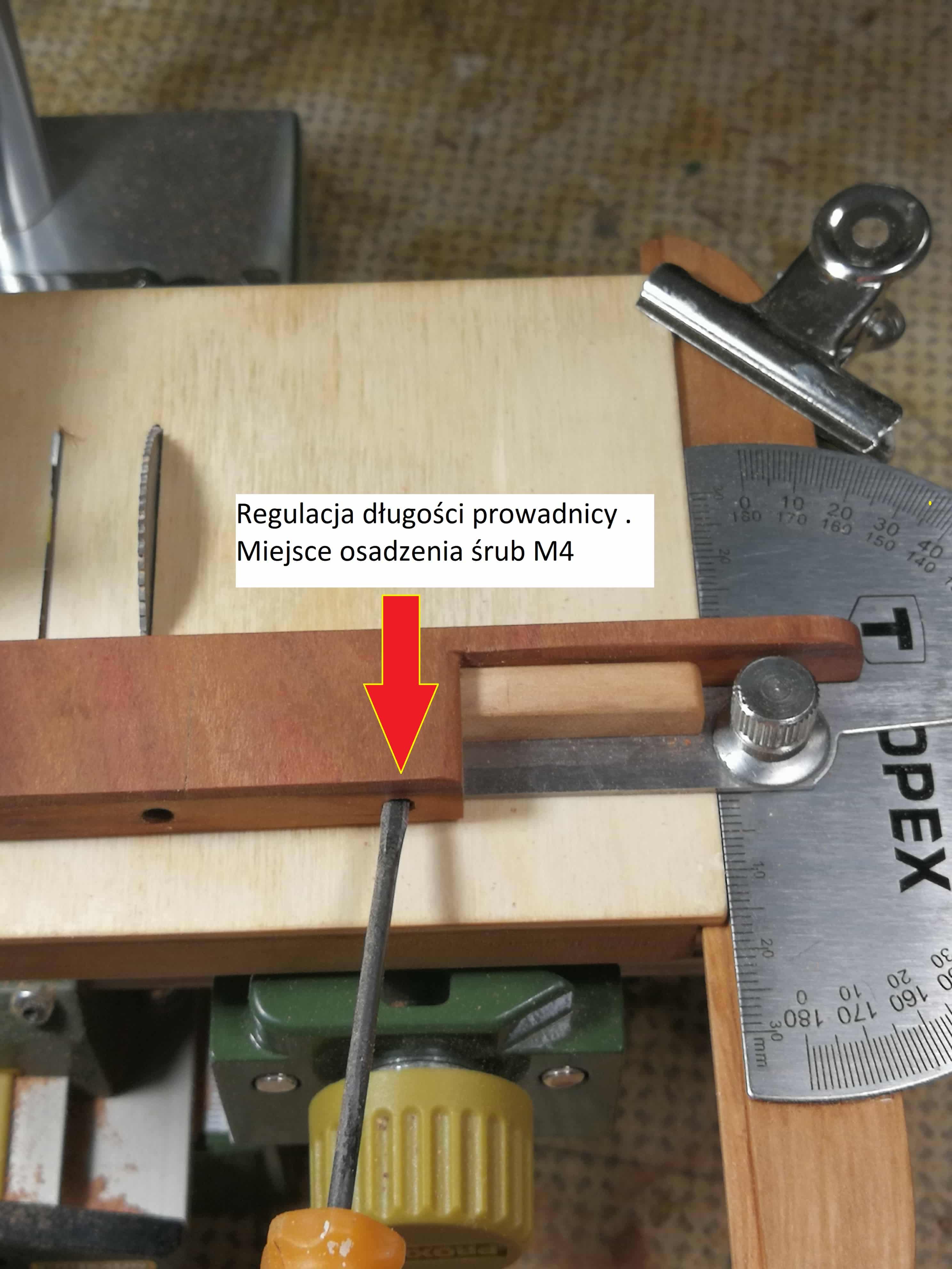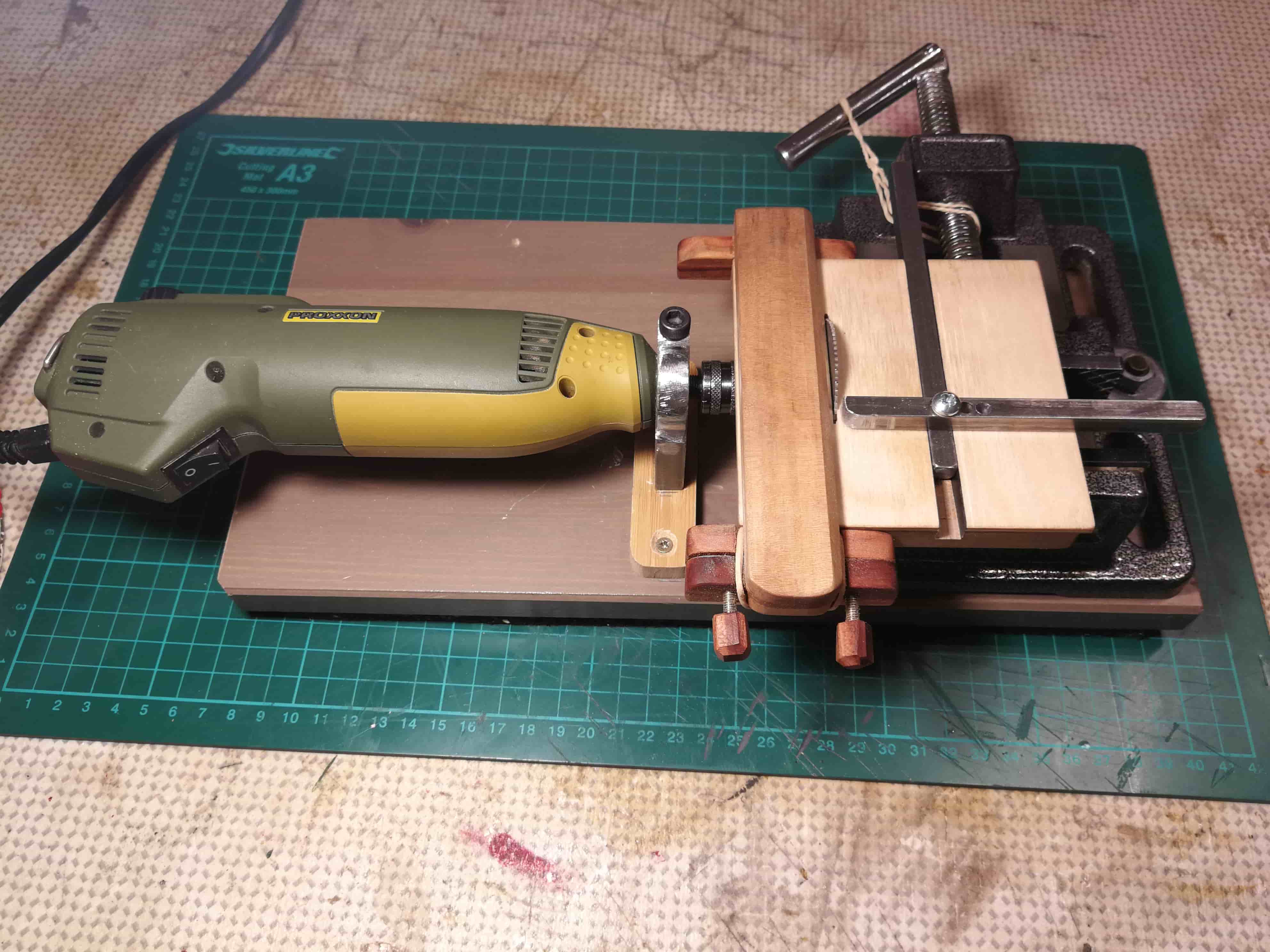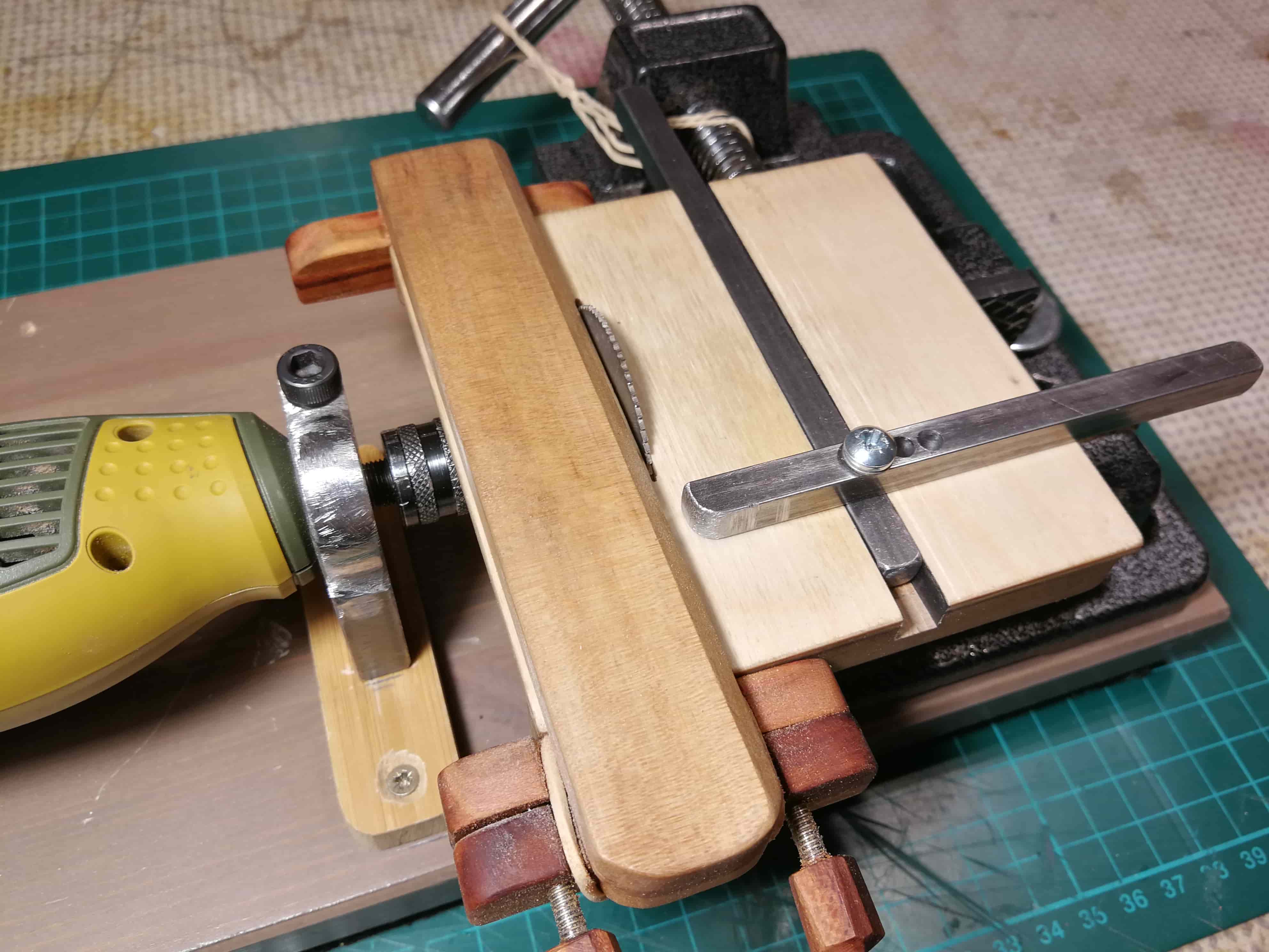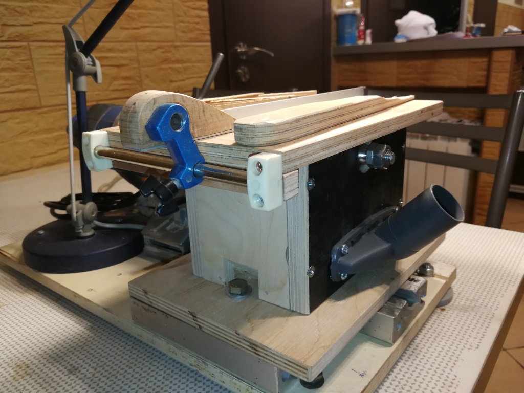 Stolik ze sklejki 3mm 10x10cm wzmocniony na krawędziach listewkami i banalnie proste zamocowanie w imadełku. Prowadnicę wzdłużną bardzo łatwo i precyzyjnie ustawia się na wymiar dzięki jej prostopadłości do stolika i długim prowadnicom po obu stronach. Wykonane są z drewna jabłoni w którym dało się bez problemu wykonać gwinty M4 do zaciskania prowadnicy.
