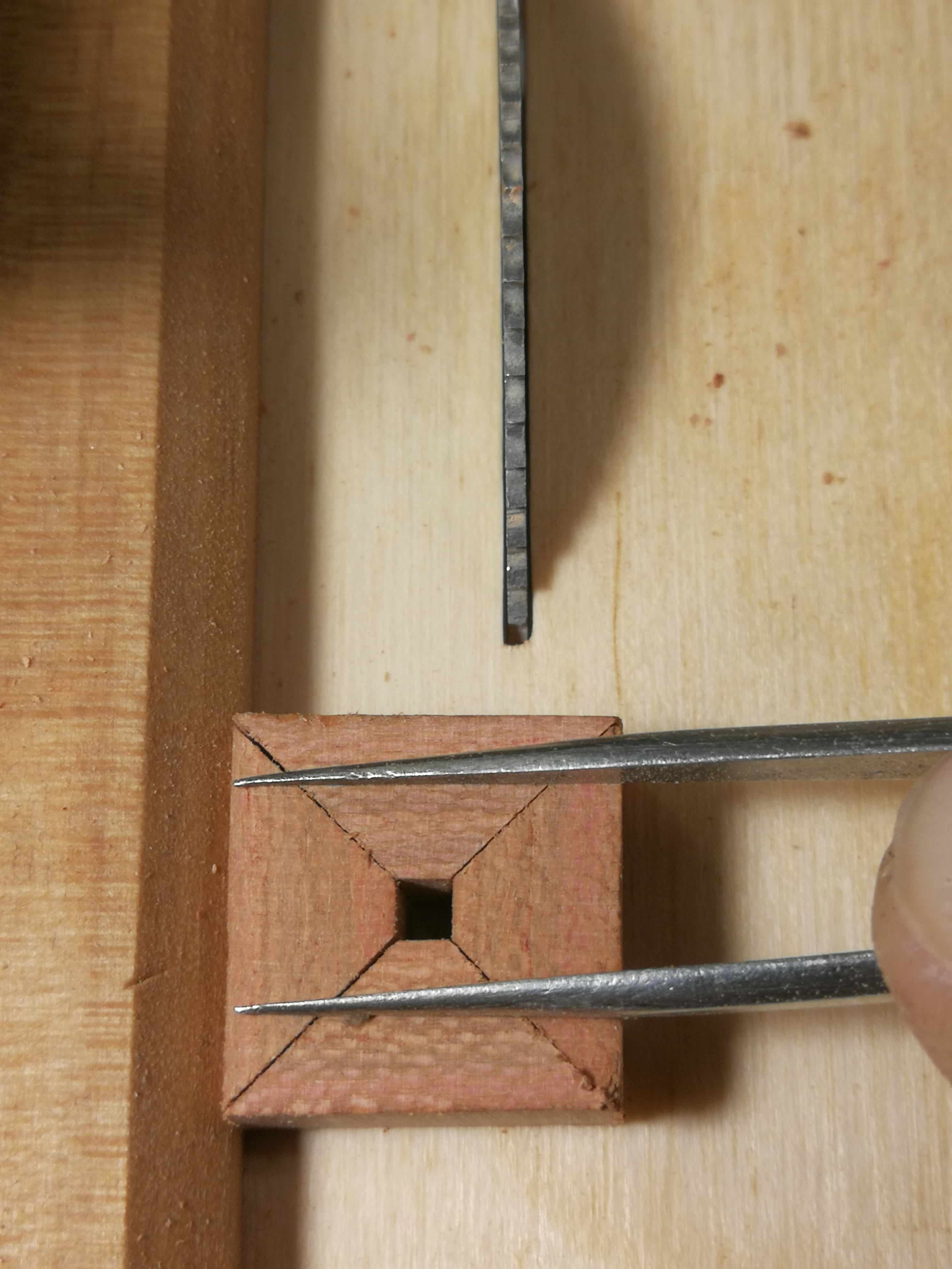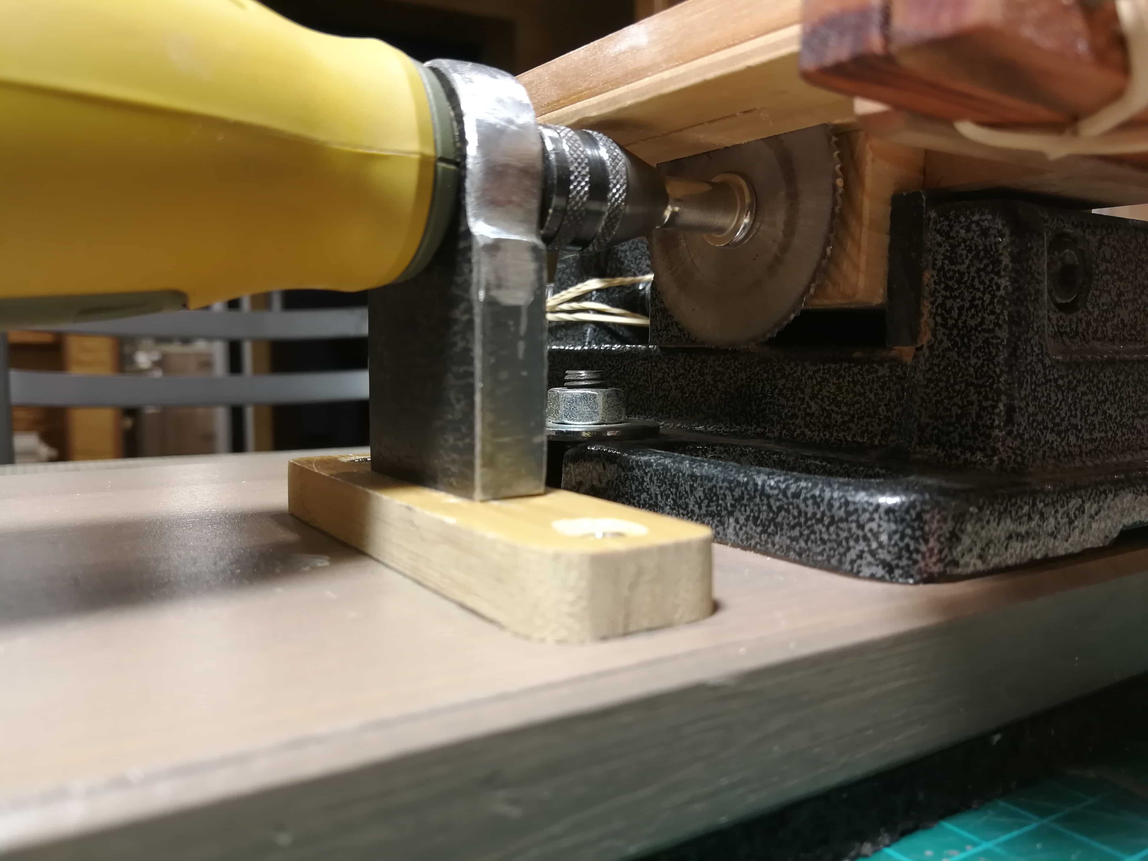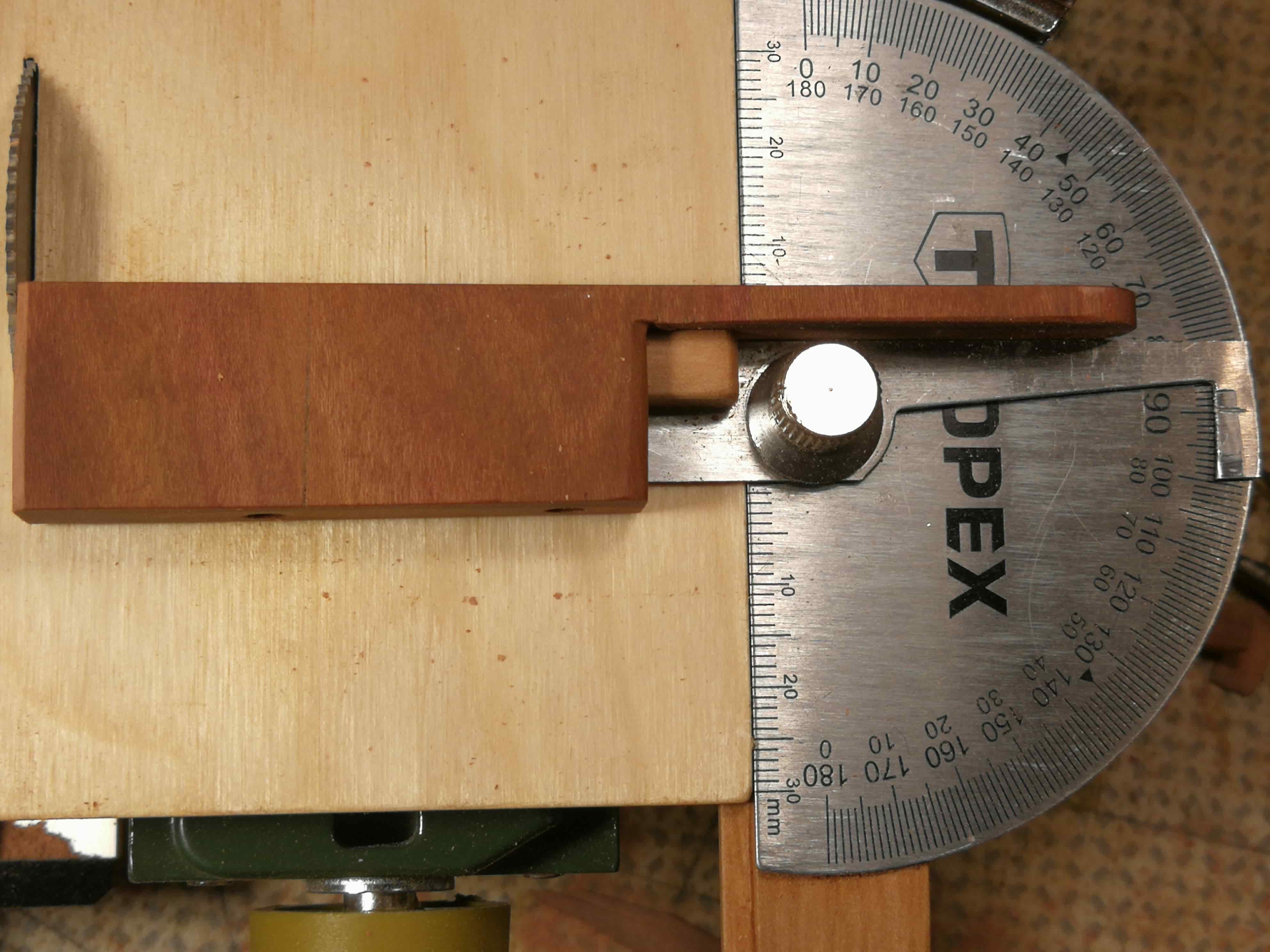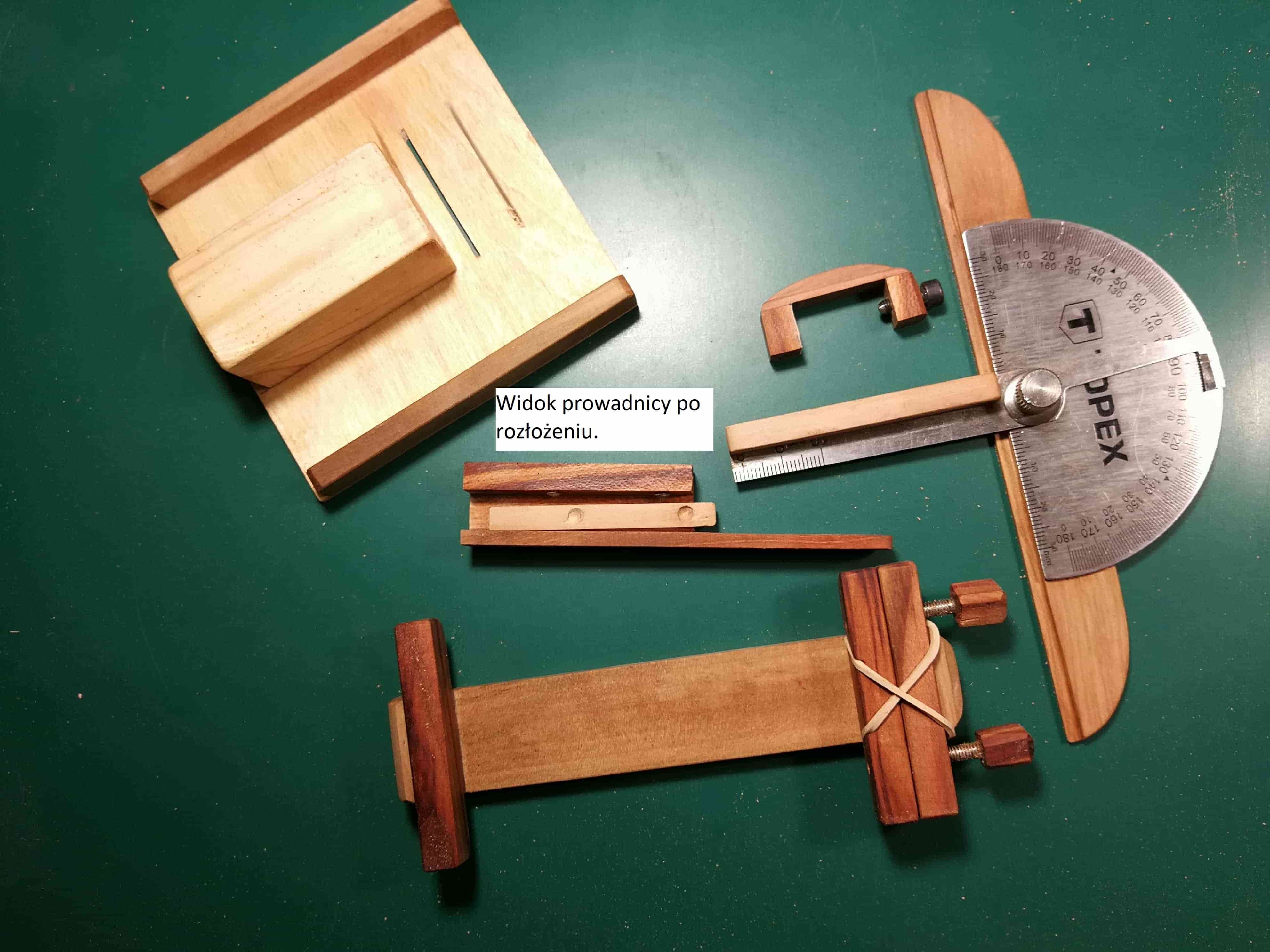 Stolik ze sklejki 3mm 10x10cm wzmocniony na krawędziach listewkami i banalnie proste zamocowanie w imadełku. Prowadnicę wzdłużną bardzo łatwo i precyzyjnie ustawia się na wymiar dzięki jej prostopadłości do stolika i długim prowadnicom po obu stronach. Wykonane są z drewna jabłoni w którym dało się bez problemu wykonać gwinty M4 do zaciskania prowadnicy.