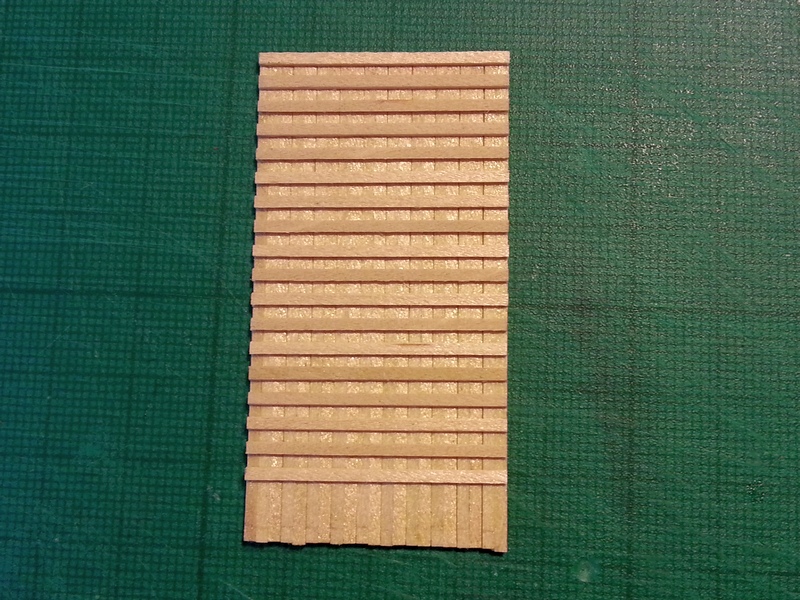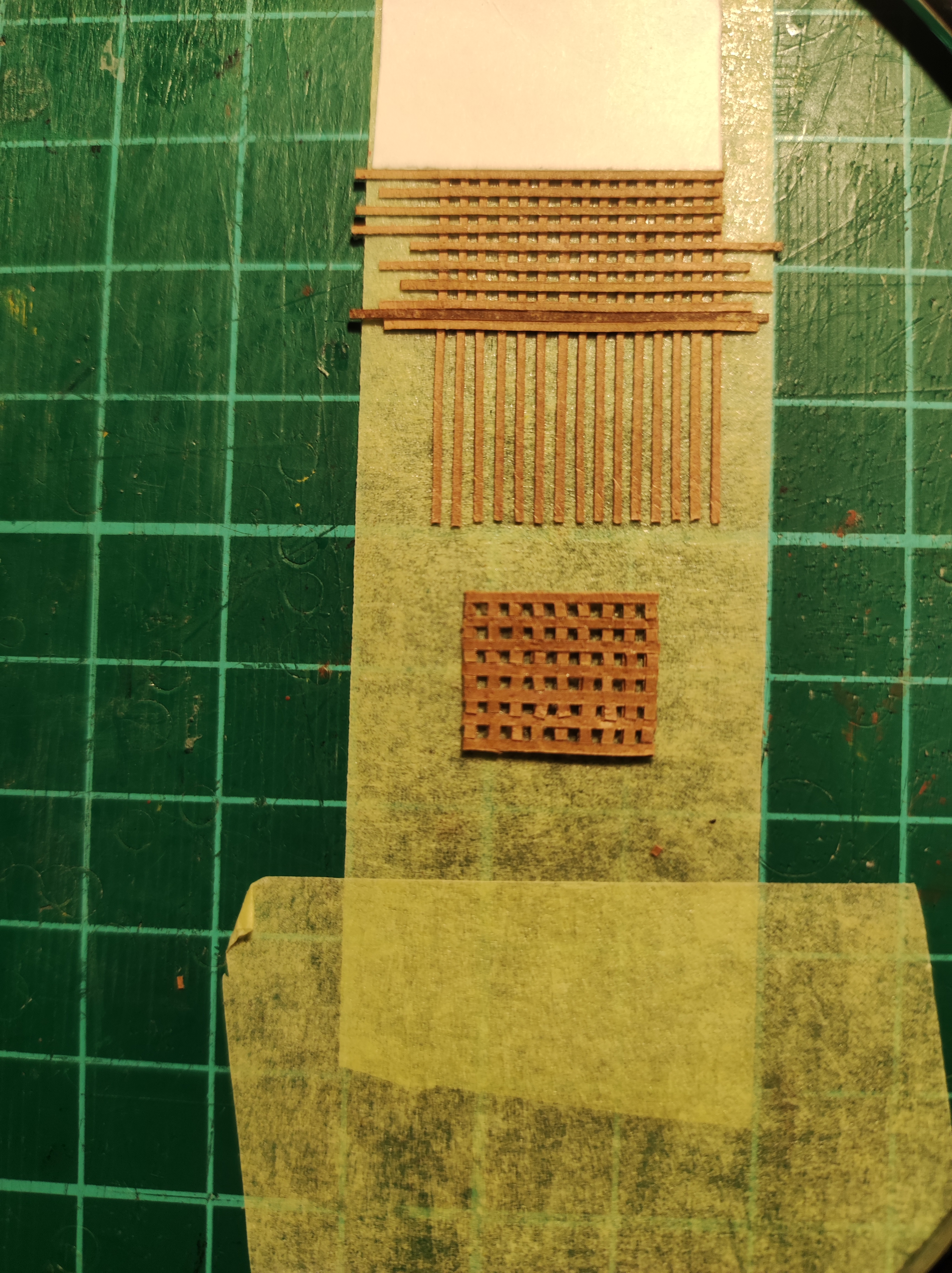Tak nacięte listewki przykleiłem na taśmę malarską, ciasno jedna przy drugiej. W swojej