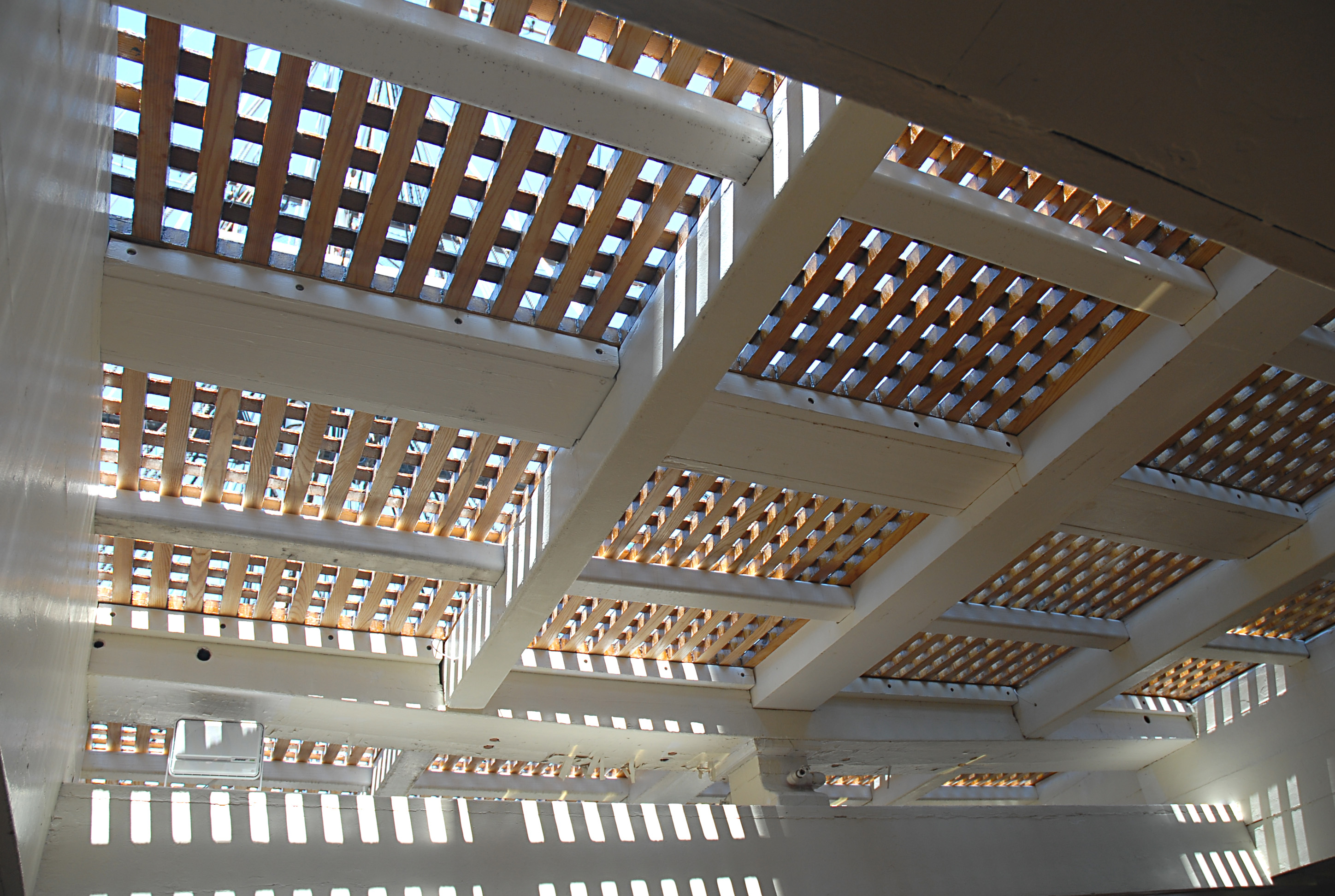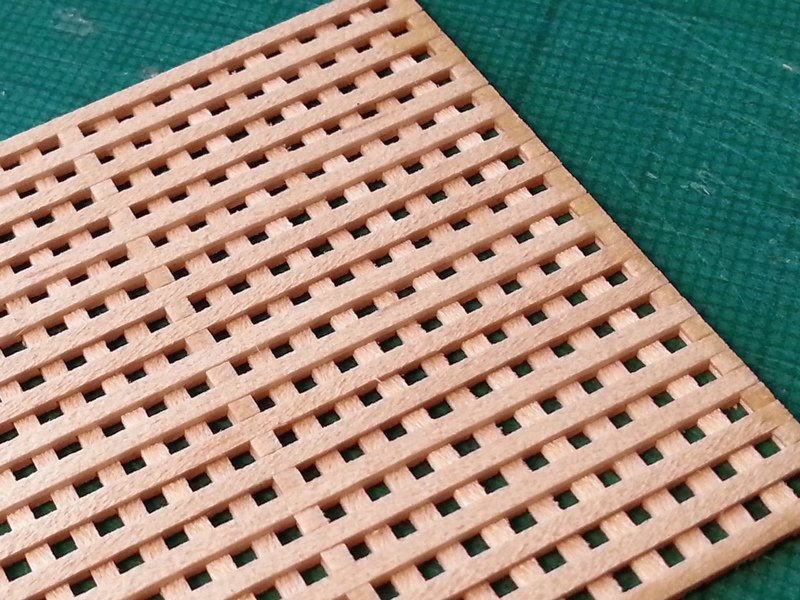 Oczywista, na gornej powierzchni pokladu gretingi powinny byc gladkie i tylko od spodu mozna zauwazyc, ze te kratki skladaja sie z dwoch typow listewek, tj. tych w/w ledges o przekroju kwadratowym, z ponacinanymi zebami i lezacych na nich w poprzek cienszych listewkach o przekroju prostokatnym, tzw. rungs.