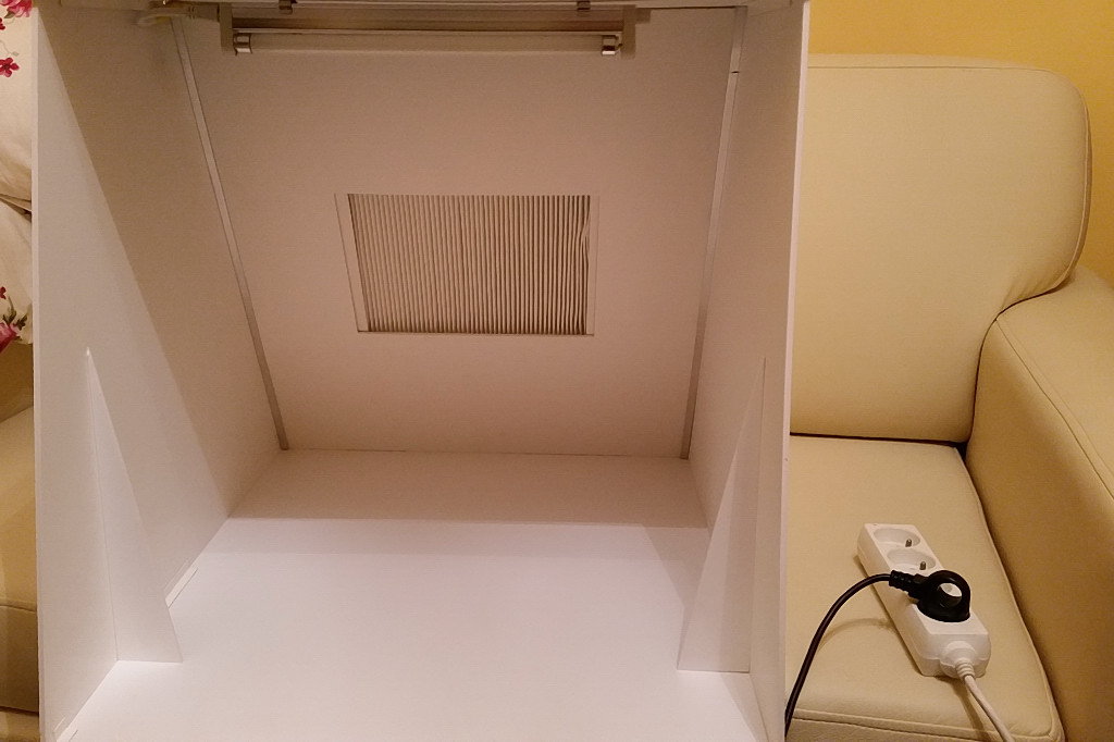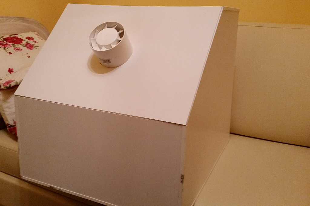 Do ukończenia pozostanie dokupienie i zamontowanie oprawy oświetleniowej, filtra przeciwpyłkowego (z jakiegoś samochodu), rury "spiro" do opcjonalnego odprowadzania "perfum" z używanych farb za okno oraz włączników i okablowania. W tylnej części skrzynki zrobię prowadnicę do wsuwanego uchwytu na filtr.