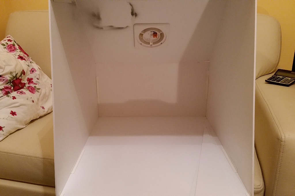 Zastanawiam się (dopóki mam jeszcze jakieś pole na manewry), czy nie zrobić rozkładanej całej komory, ze względu na jej gabaryty... W mieszkaniu, w bloku liczy się każdy cm3, dlatego nie przykleiłem jeszcze dodatkowych, usztywniających zastrzałów z PCV. Całość i tak jest w miarę sztywna, dzięki wklejeniu wzmocnień z kątownika także w środku skrzynki.