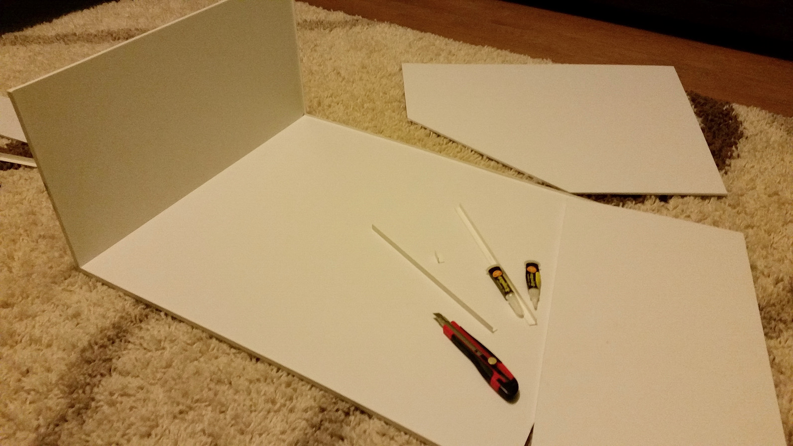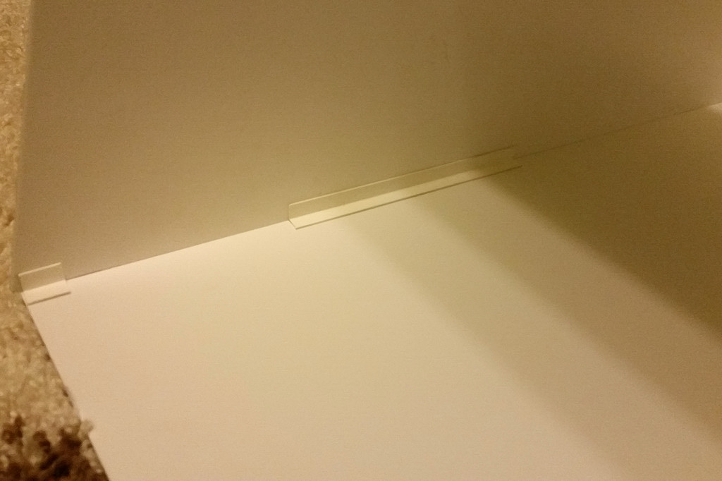- górna pokrywa nie jest jeszcze przyklejona i chyba nie będzie przyklejona, łatwiej będzie dostać się do zamontowanej w niej oprawy oświetleniowej. Nie przesuwa się na boki i usztywnia konstrukcję, dzięki przyklejonym od środka kątownikom tylko do pokrywy, dokładnie na szerokość bocznej ściany.