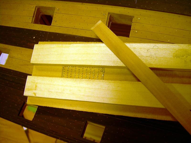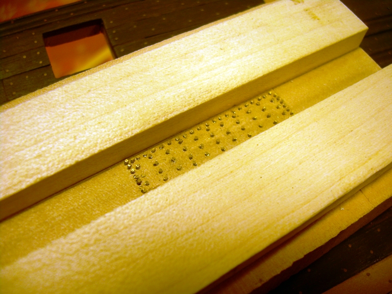 Zrobiłem prosty przyrząd do odciskania śladów gwoździ. Druty mosiężne 0,5 mm w rozstawie wg planów przeszlifowane na taką samą wysokość. Rynienka o szerokości taśmy miedzianej dla witrażystów, która szczęśliwie pasuje do skali.