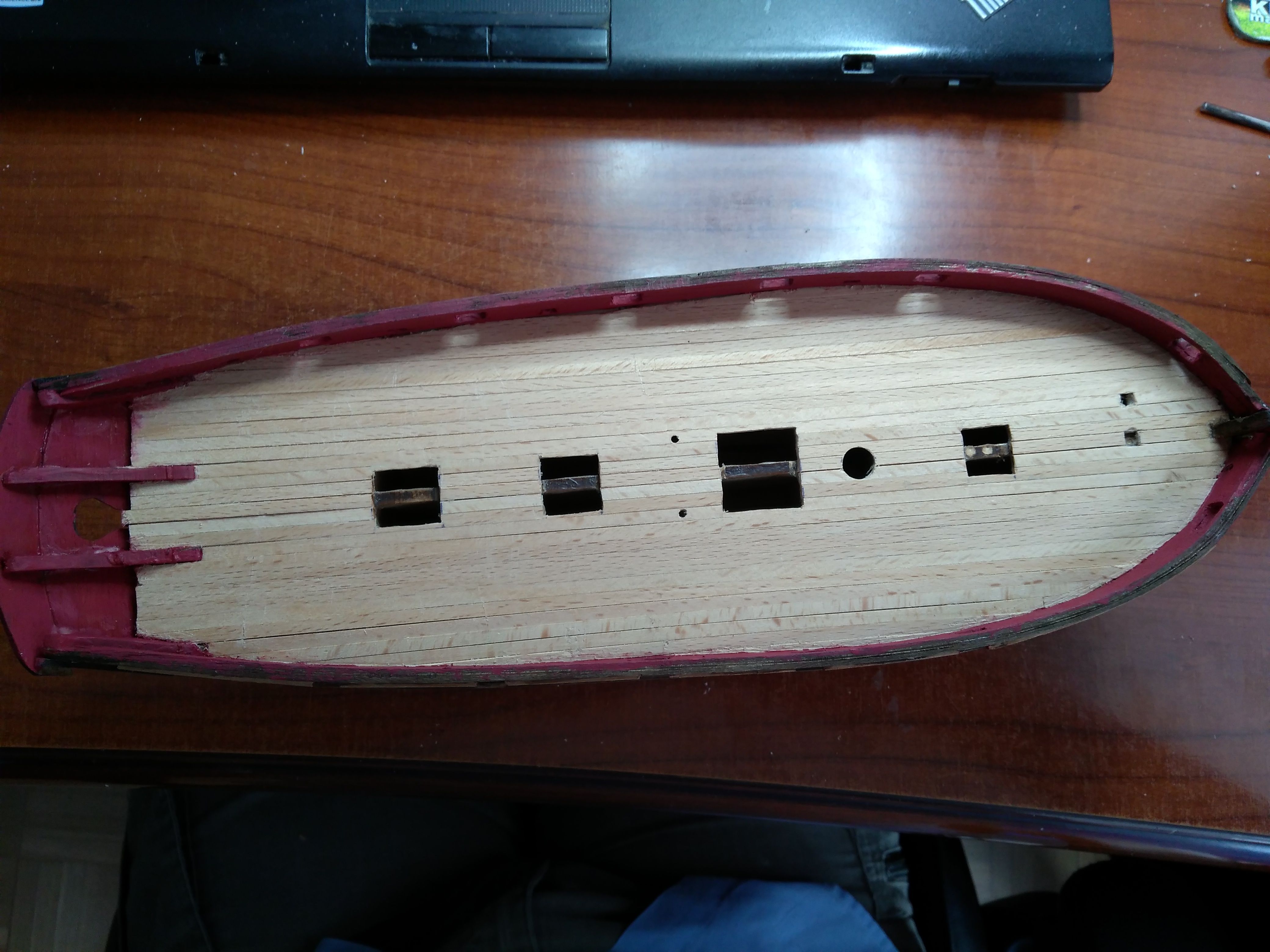 Najgorsze były listewki, które poszły na trzecią warstwę - po 3 na stronę. 1 jasna cięta na furtach działowych i dwie poniżej, które będą malowane na czarno. Nie wiem jak je przykleić, żeby nie odstawały przy samym dziobie. (wszystkie były najpierw nacinane skalpelem od wewnętrznej strony potem gięte nam mokro).