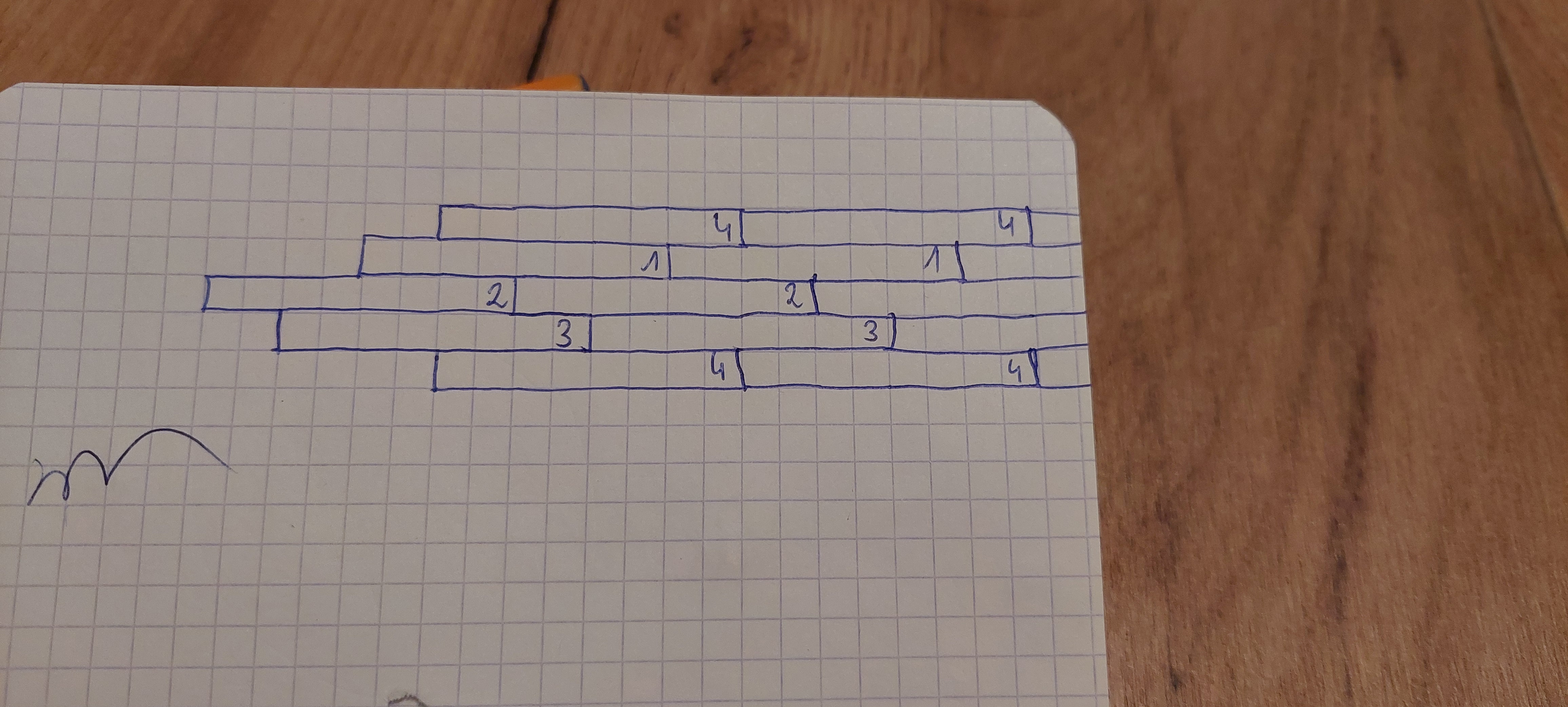 Z braku zachowanych oryginalnych historycznych dokumentow z budowy owych portugalskich nao, ja bym sie raczej sklanial do ukladu tzw. "3 butt shift", tj. pomiedzy owymi laczeniami planek powinny zawsze biec dwie lite, tj. nie laczone planki (dla zachowania sztywnosci calosci). W duzych okretach wojennych planki pokladowe byly laczone wg. wzoru "4 butt shift" albo nawet "5 butt shift".