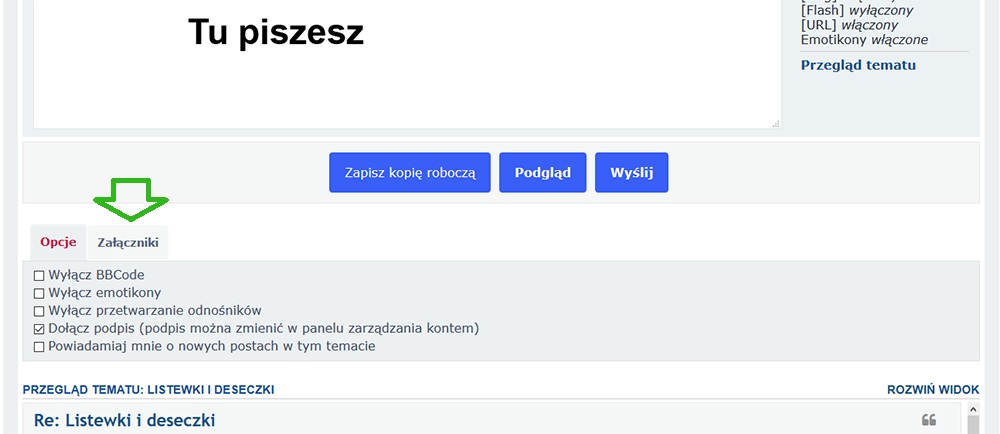 Pod edytorem, pod niebieskimi "przyciskami" m.in. Podgląd i Wyślij - szukaj Opcje i obok Załączniki