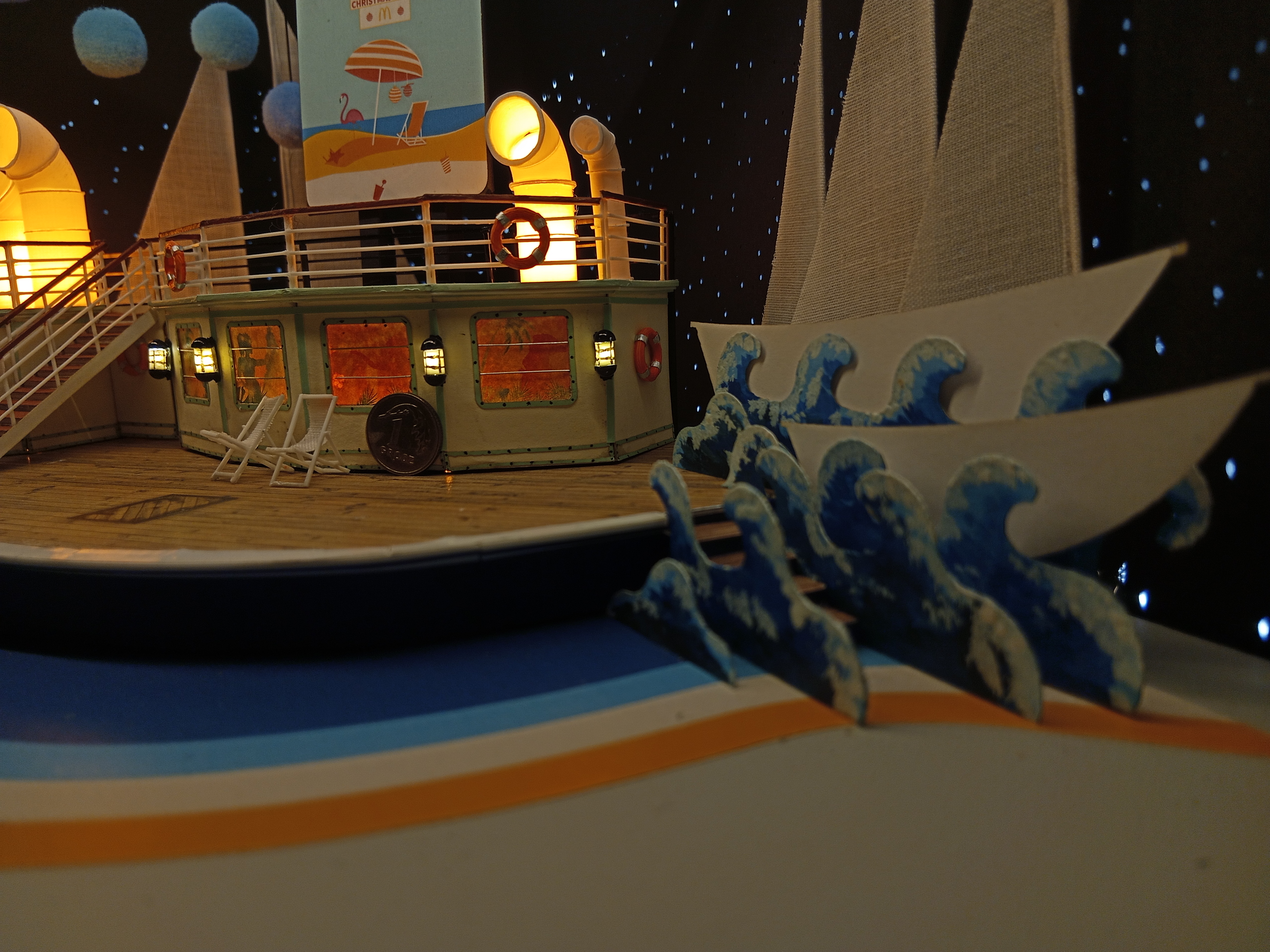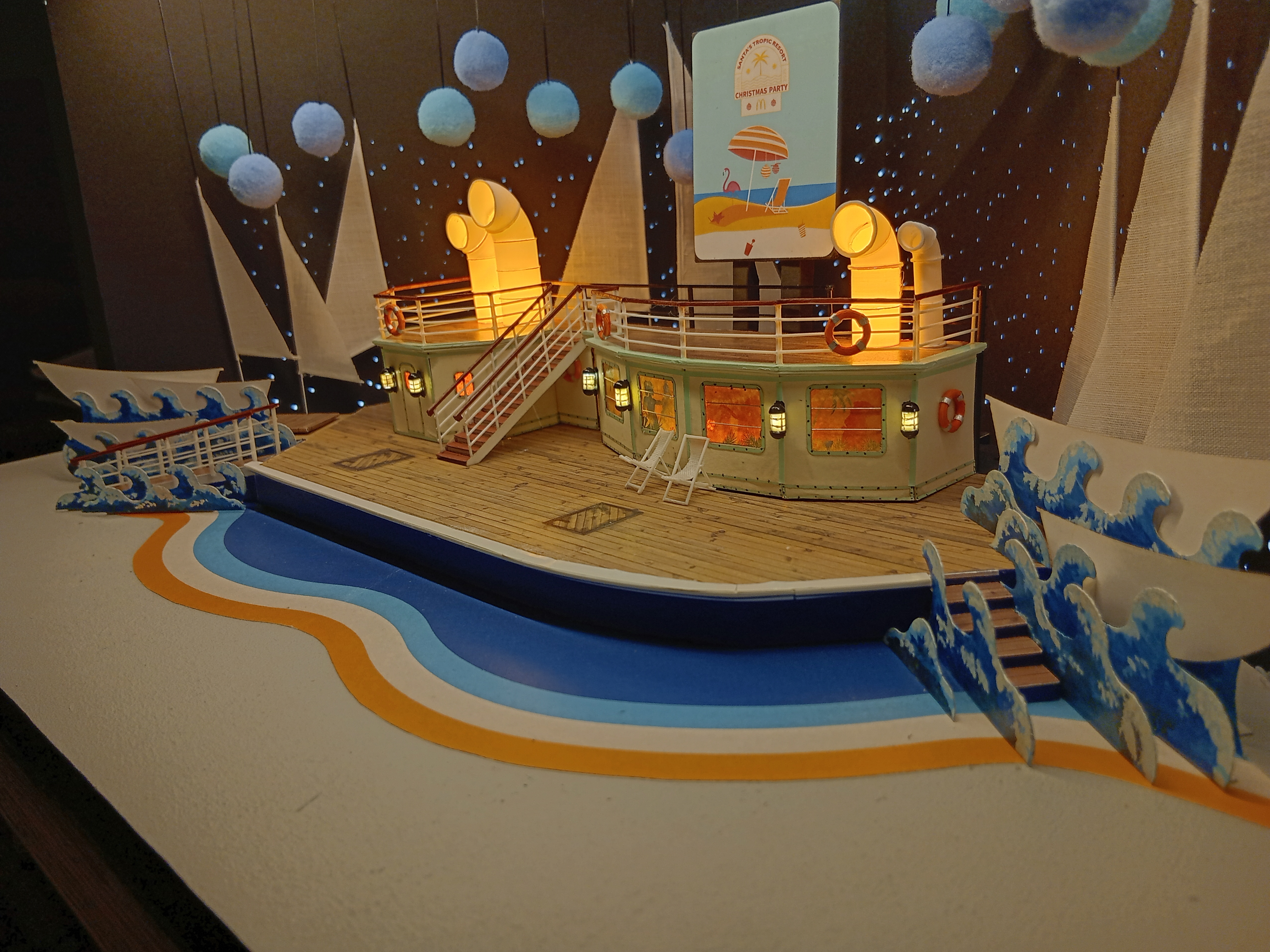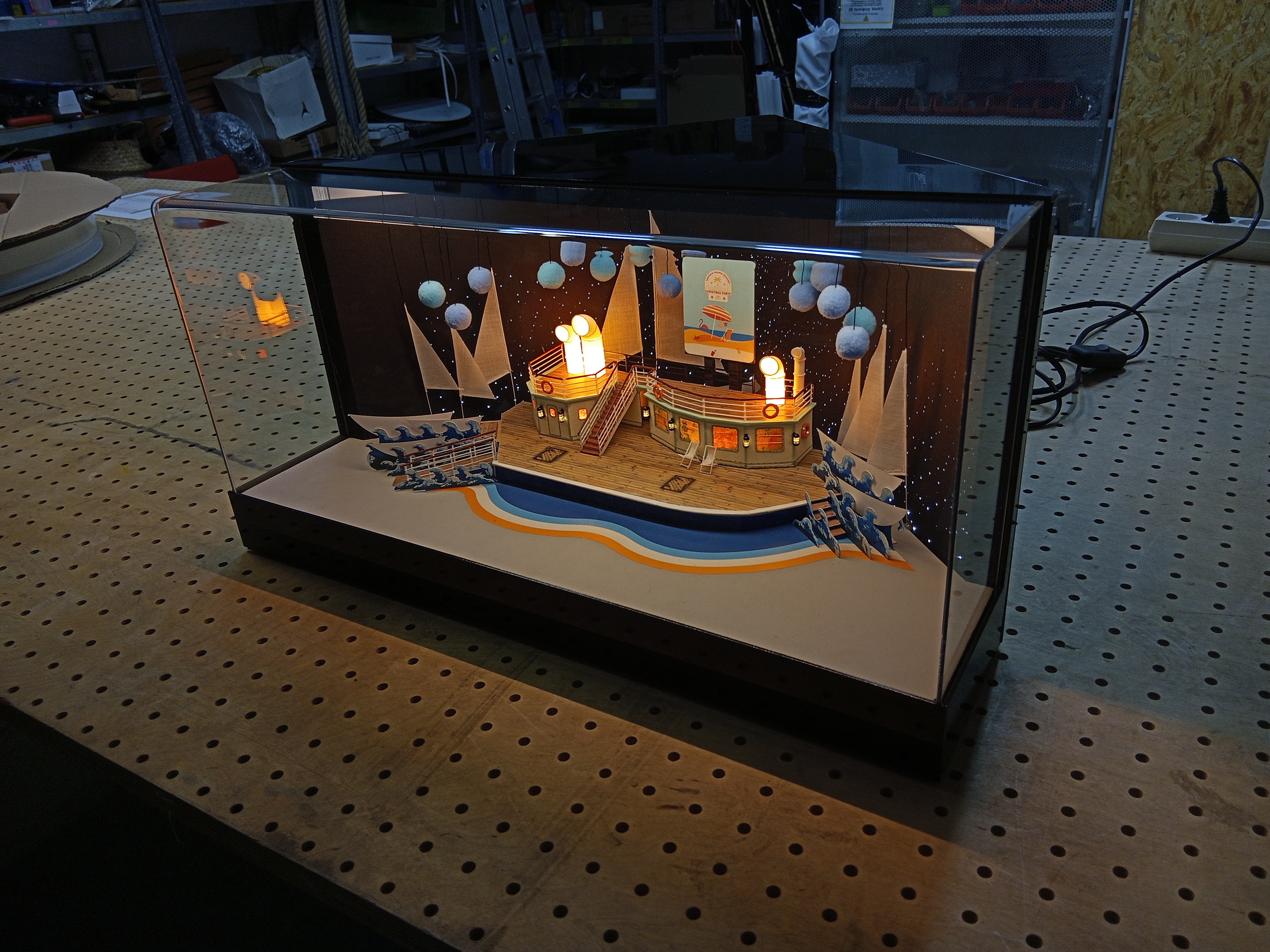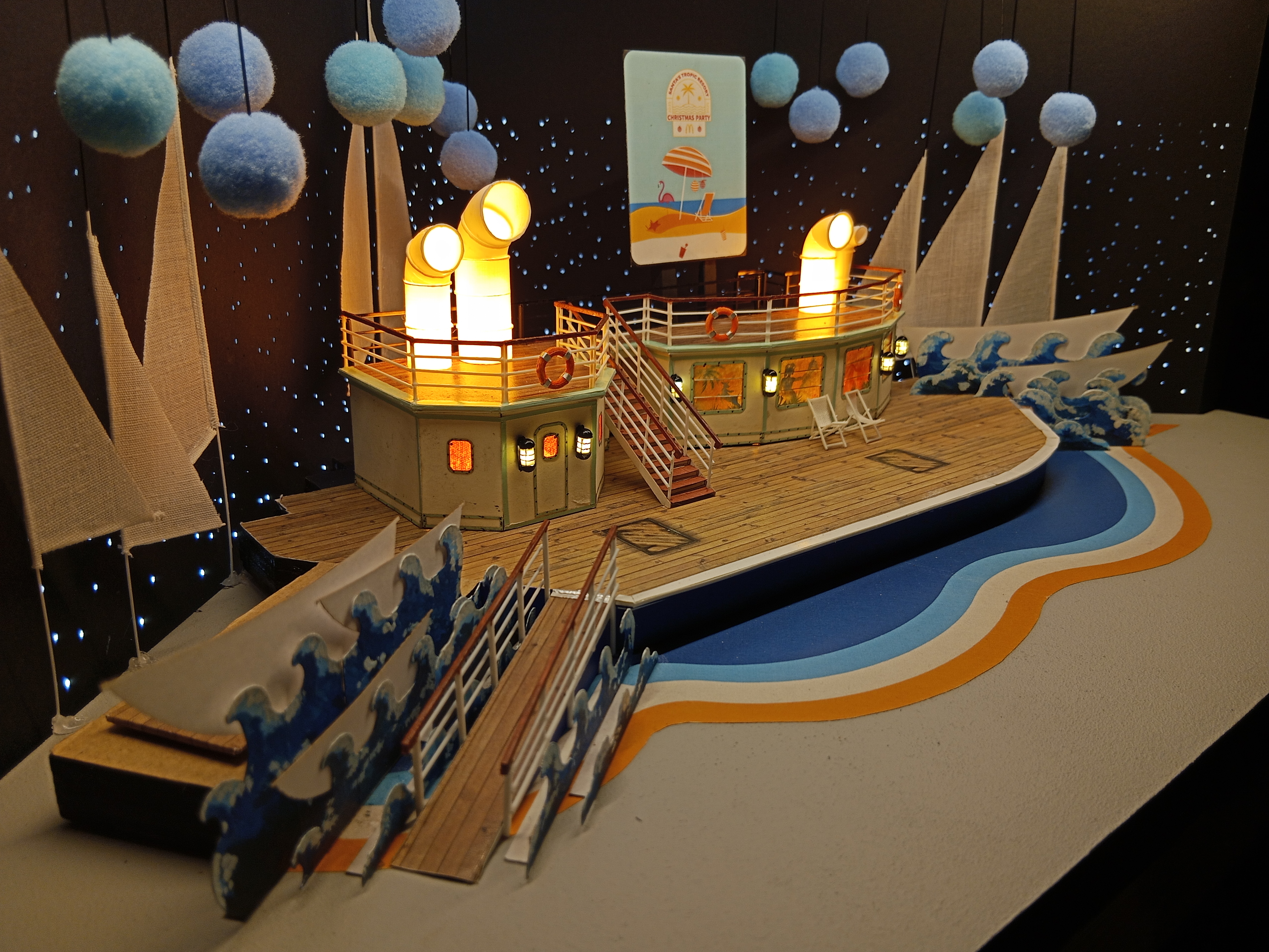 zostałem z racji zawodowych (zajmuję się obecnie scenografią eventową) zobligowany do wykonania makiety sceny, którą budowaliśmy pod koniec zeszłego roku na imprezę bożonarodzeniową dla poważnego gracza w branży hamburgerowej... Ot, klient sobie zamówił modelik w skali 1:75, a że tematyka marynistyczna poniekąd, to pozwalam sobie zamieścić rezultat działań.