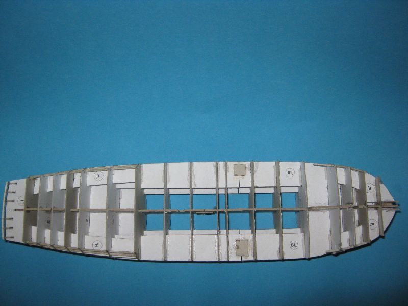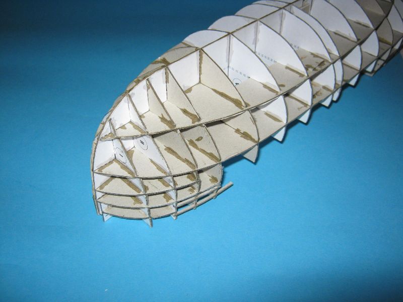 Kadłub jest sklejony prosto i sztywno a brzegi wręgów nasączone super glue, przygotowany pod piankowanie.