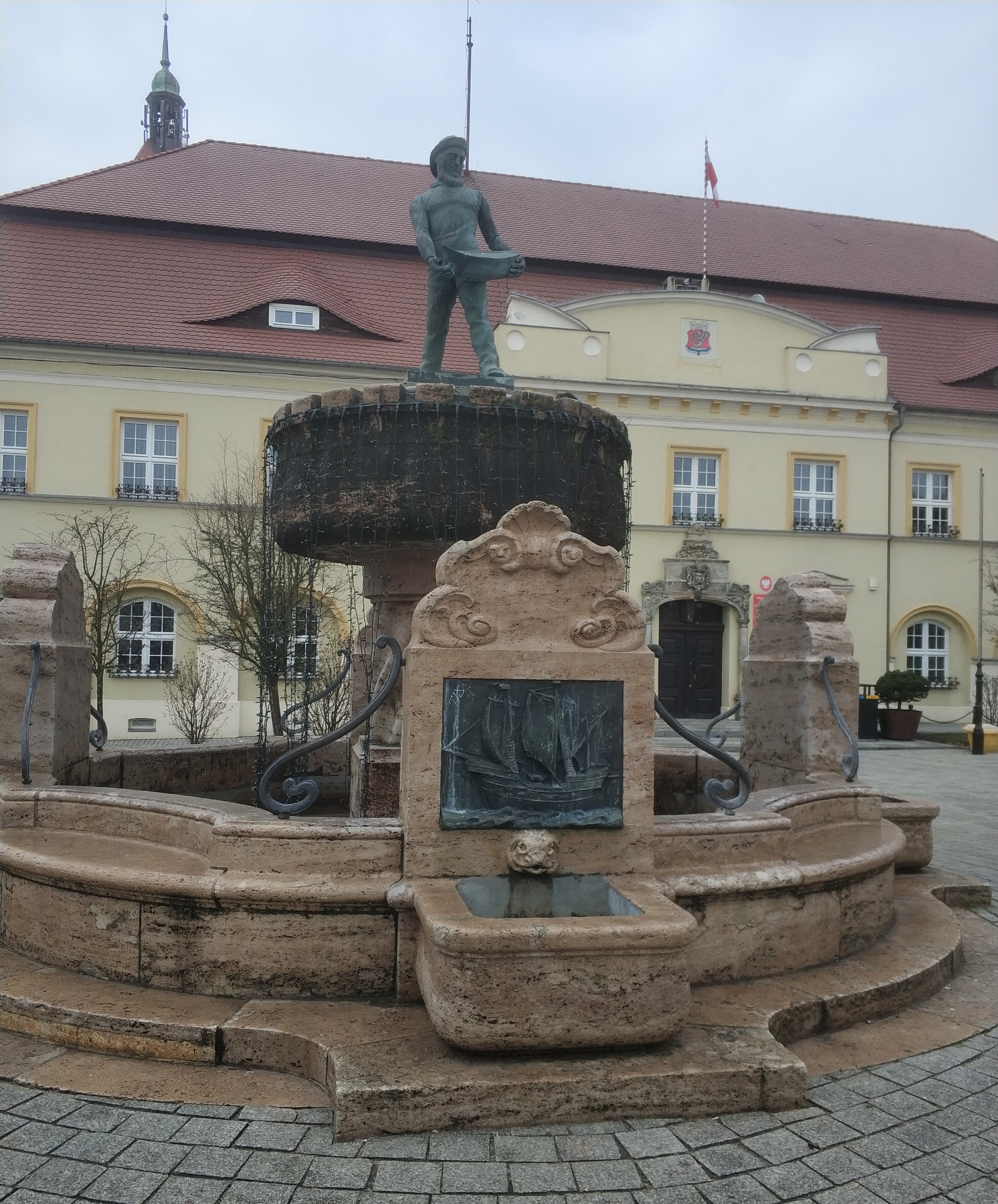 Na rynku w Darłowie stoi pomnik rybaka: