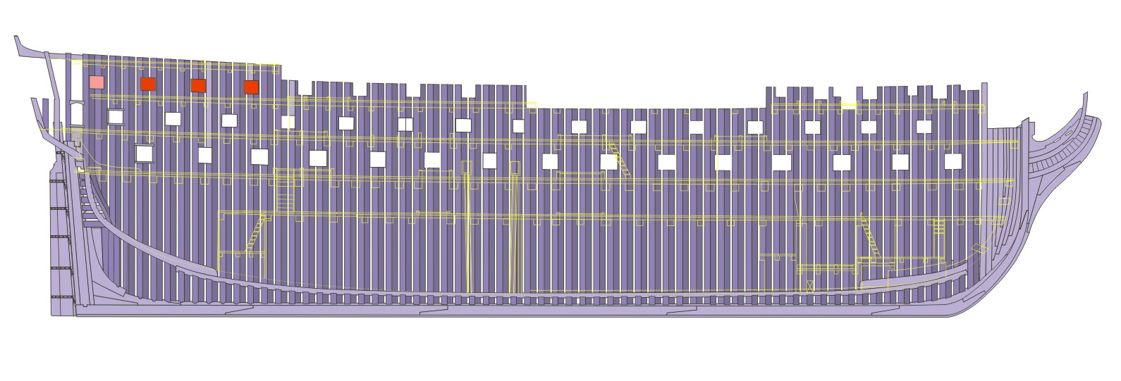 W trakcie przebudowy rufy Anglicy zamknęli pierwotnie dwie furty w pawęży, za to stworzyli sześć nowych: w tym co w oryginalnym układzie było "chambre du conseil" (grand cabin), w kabinach oficerskich i w sterówce (na rysunku zaznaczone na czerwono). W jednostkach bliźniaczych ("Achille", "Scipion","Ville de la Marseille", "L'Aigle"- praktycznie we wszystkich okrętach tego typu których przedstawienia udało mi sie znaleźć) w tych miejscach są okienka. W części z nich furta zaznaczona na różowo również jest oszklona i ze szprosami (na rycinach z epoki napoleońskiej czyli nie jest to dużo późniejsza przeróbka).