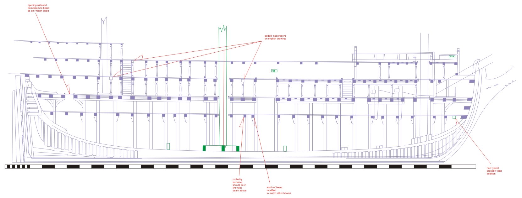 Przód przerysowany według wzoru (fiolet). Belki i linie pokładów zachowane identyczne jak w rysunku angielskim, to samo z głównymi liniami. Zaczyna się robić czyściej.