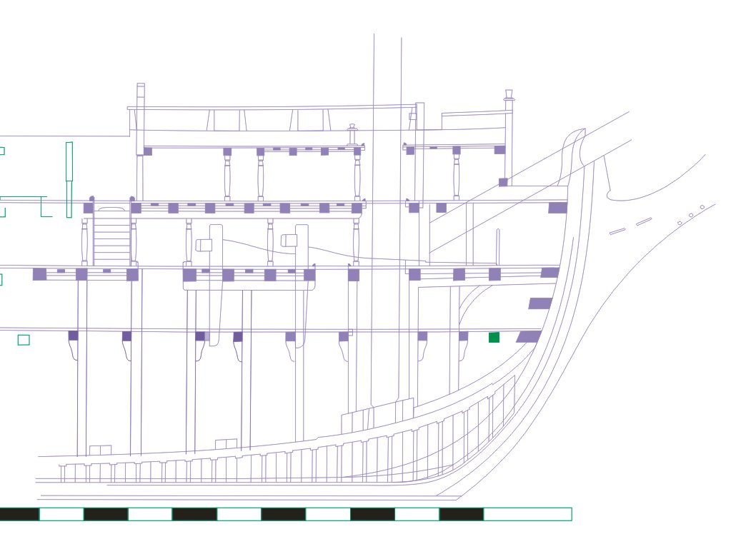 Przód przerysowany według wzoru (fiolet). Belki i linie pokładów zachowane identyczne jak w rysunku angielskim, to samo z głównymi liniami. Zaczyna się robić czyściej.