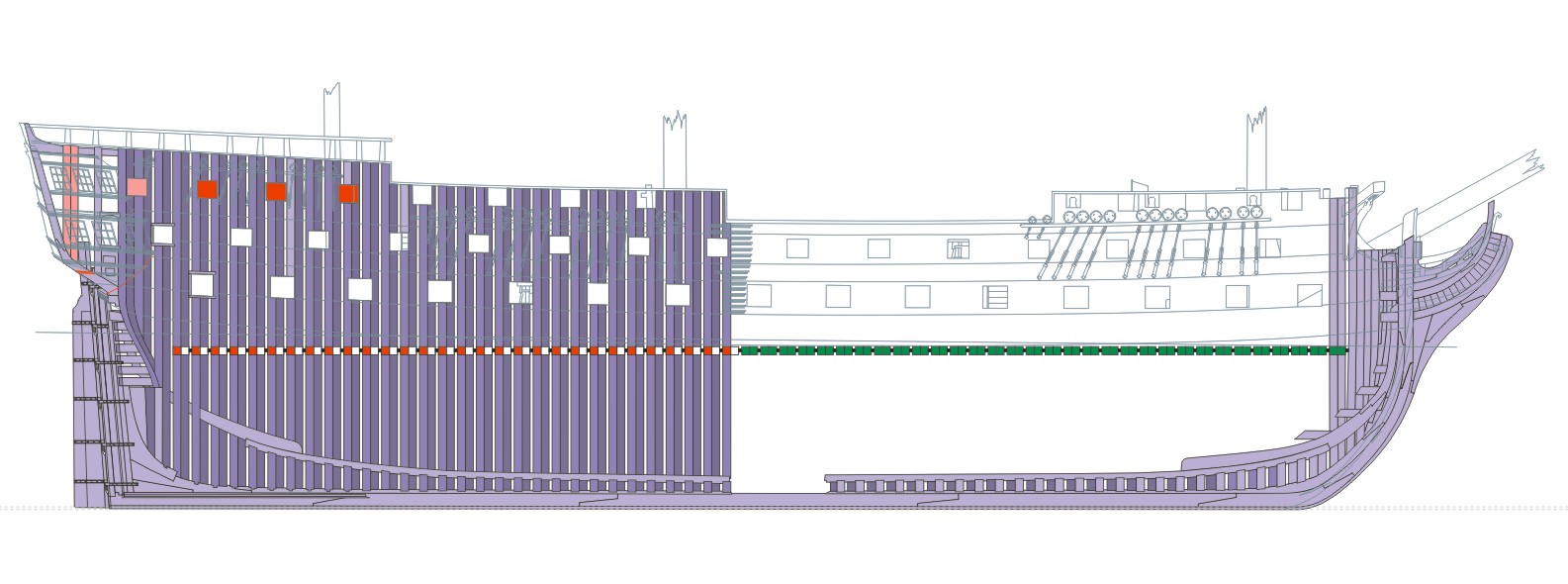 W trakcie przebudowy rufy Anglicy zamknęli pierwotnie dwie furty w pawęży, za to stworzyli sześć nowych: w tym co w oryginalnym układzie było "chambre du conseil" (grand cabin), w kabinach oficerskich i w sterówce (na rysunku zaznaczone na czerwono). W jednostkach bliźniaczych ("Achille", "Scipion","Ville de la Marseille", "L'Aigle"- praktycznie we wszystkich okrętach tego typu których przedstawienia udało mi sie znaleźć) w tych miejscach są okienka. W części z nich furta zaznaczona na różowo również jest oszklona i ze szprosami (na rycinach z epoki napoleońskiej czyli nie jest to dużo późniejsza przeróbka).