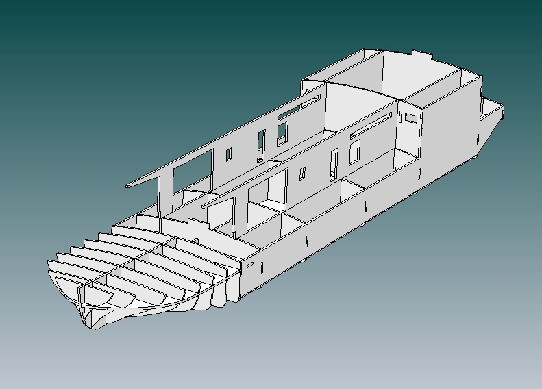Kadłub jest prosty wiec można by było zrobić go wraz z nadbudówkami z polistyrenu i PCV a nadbudówki później obkleić np. fornirem tak samo jak pokład