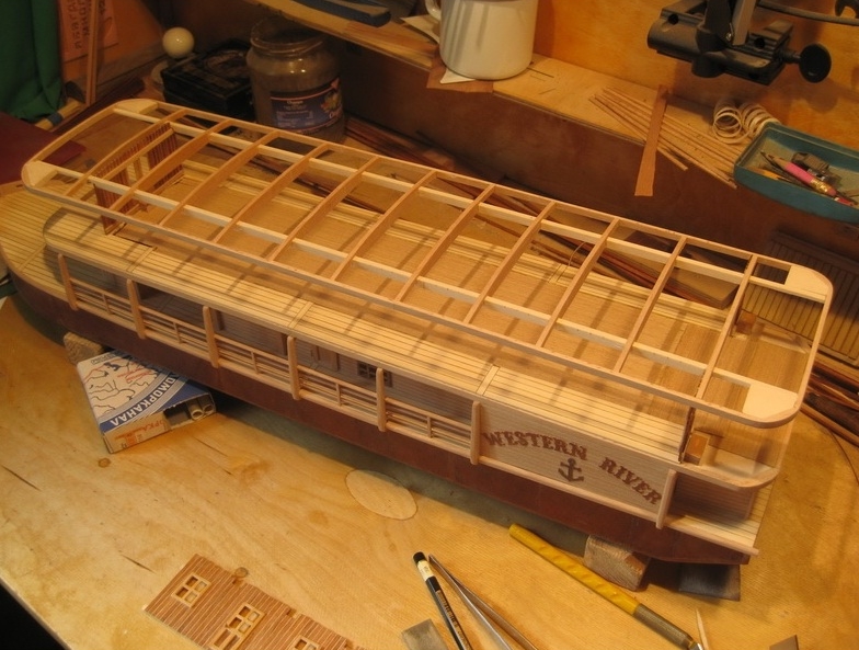 Projekt nad którym pracuję, zakłada wykonanie modelu z PCV i polistyrenu a następnie oklejenie pokładów i nadbudówek fornirem (0.6 mm). Myślę że doświadczeni modelarze których nie brakuje na Kodze, na podstawie rysunków wręg i elementów szkieletu potrafią zrobić model tak jak Vladimir Churilin na tej fotce: