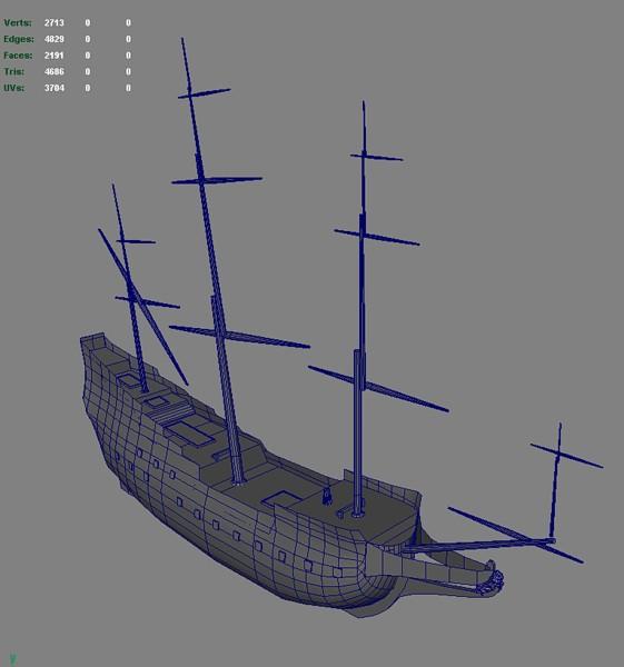 Wracając do modelu- niestety (lub stety) wersja którą teraz buduję ma trafić do gry. Z tego powodu obowiązują mnie bardzo ścisłe ograniczenia zarówno jeśli chodzi o ilość poligonów jak i dobór materiałów (i jedgo i drugie mam narzucone z góry). Po skończeniu tej pańszczyzny mam zamiar uszczegółowić model i zrobić go "na poważnie", póki co wrzucam podgląd bukszprytu z początkami want.