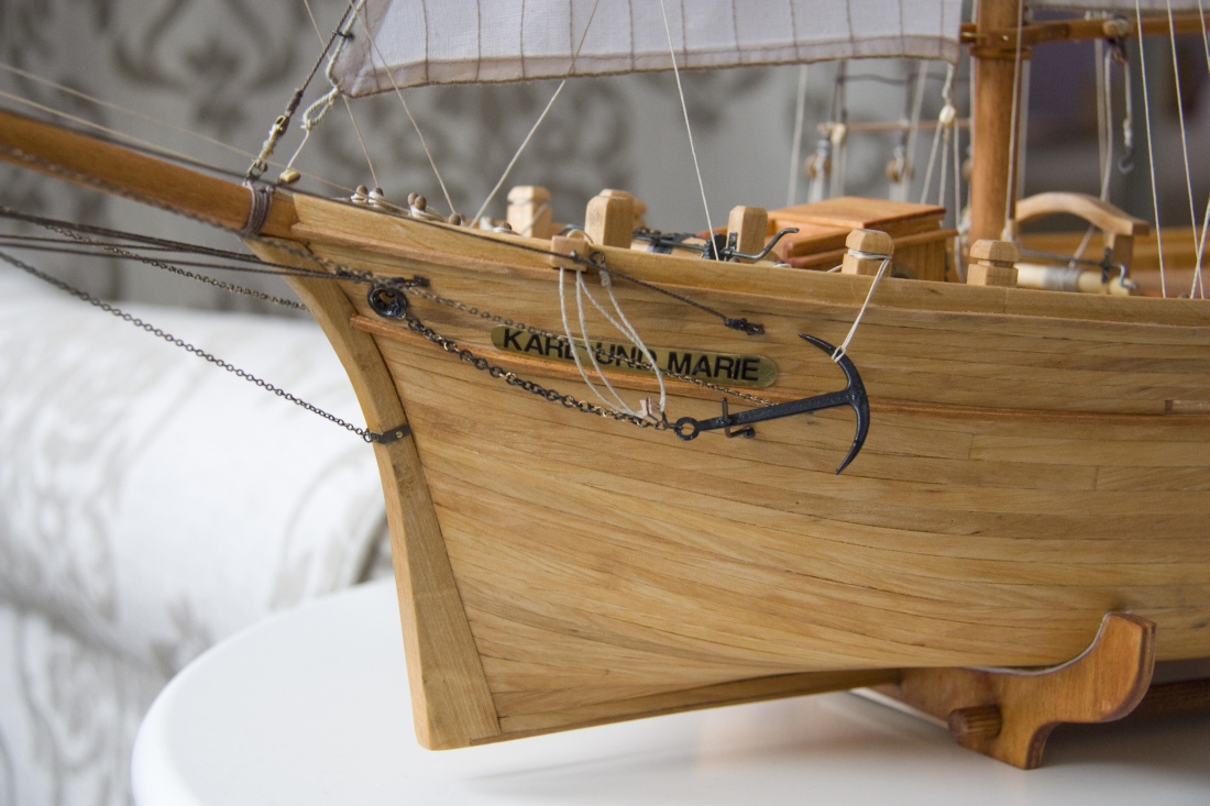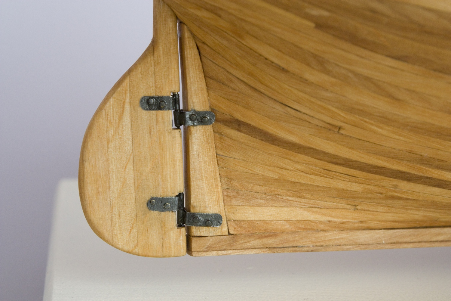 Kadłub wykonany jest z olchy a wszystkie nadbudówki z listewek z topoli i pomalowane bejcą olcha.