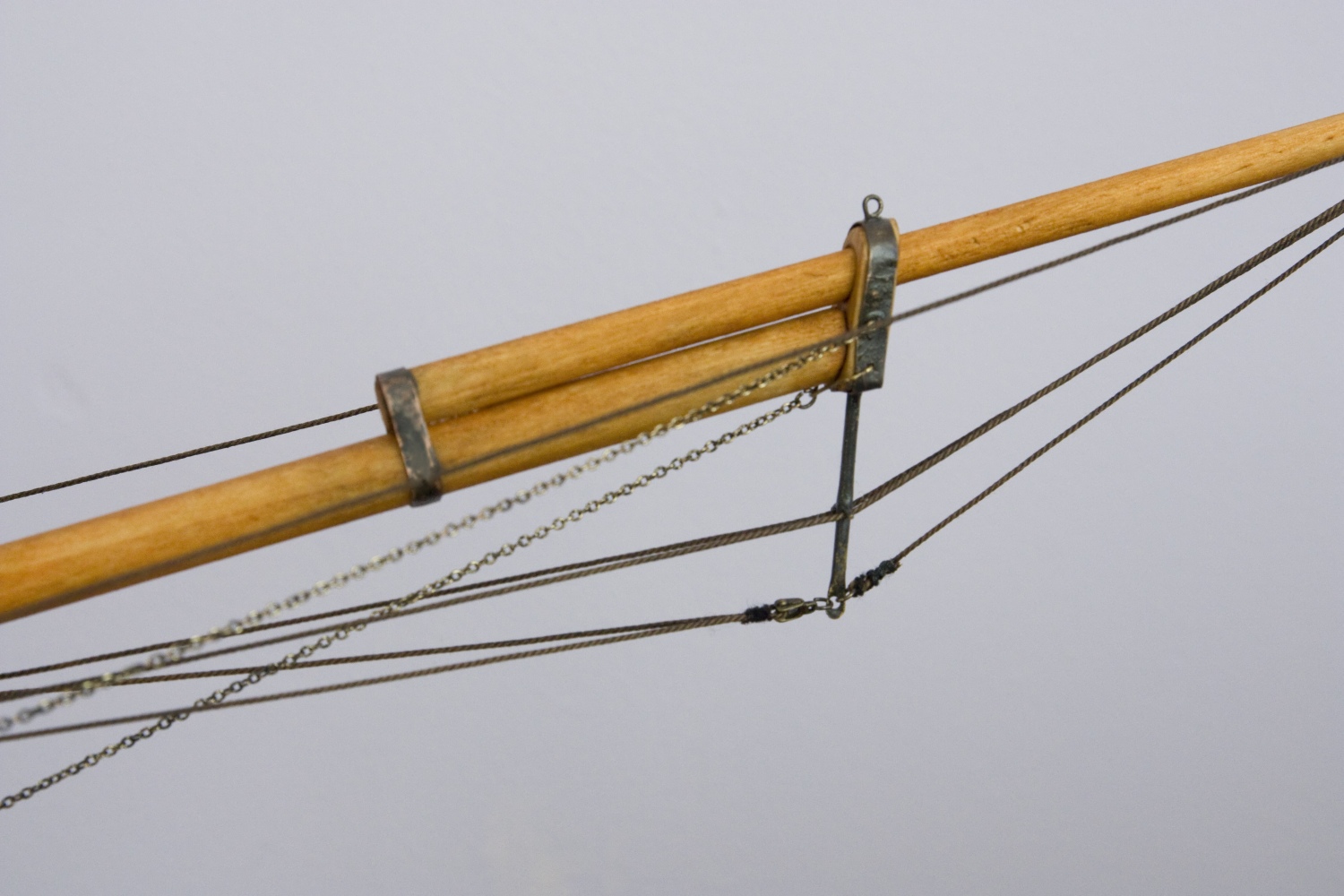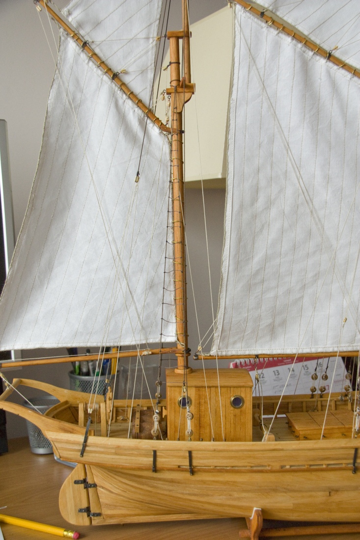 Trochę nietypowy sposób wykonywania olinowania, ale po doświadczeniach z Cutty Sark stwierdziłem, że tak będzie łatwiej. Powiesiłem żagle i zrobiłem olinowanie ruchome bez mocowania lin na stałe. Olinowanie stałe jest tylko wiązane do masztów.