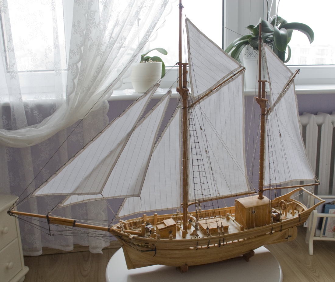 Kolejna próba to nasączenie żagli Caponem. Ta metoda jest dobra do żagli rejowych. Można je wtedy ładnie uformować. Przy dużych żaglach gaflowych wyglądały one jak z kartonu. Ostatecznie krawędzie żagli powinąłem i obszyłem na maszynie. Liklinę przyszyłem na okrętkę Wykonanie na miarę moich umiejętności krawieckich (czyli prawie żadne).