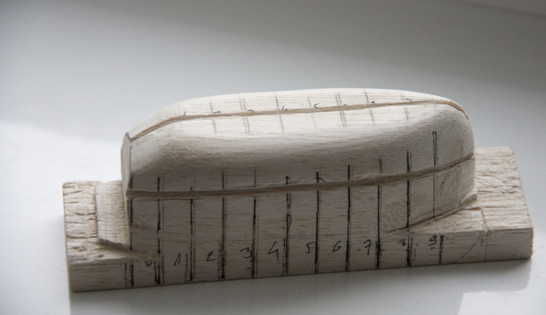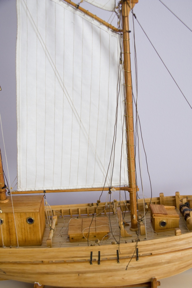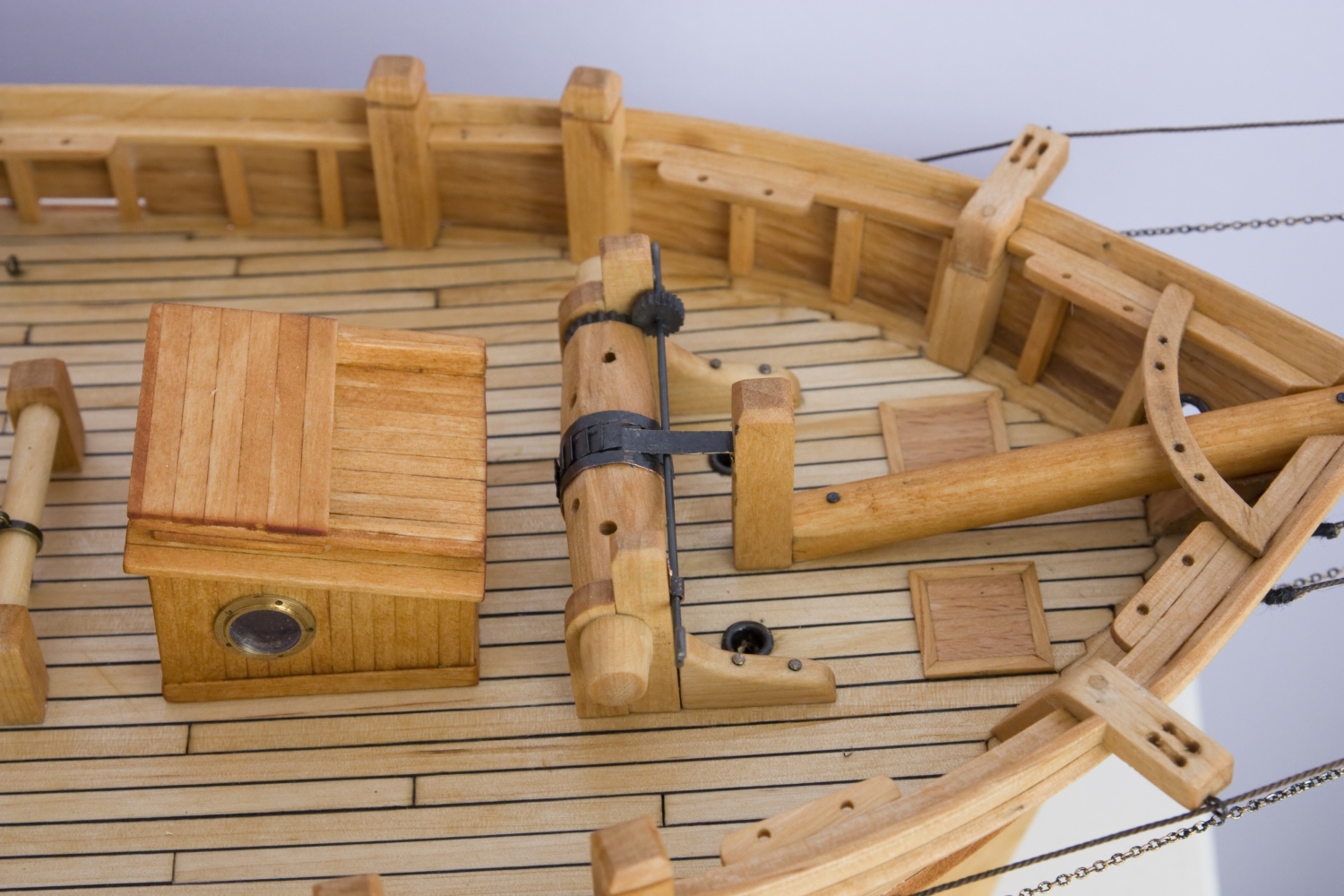 Kadłub wykonany jest z olchy a wszystkie nadbudówki z listewek z topoli i pomalowane bejcą olcha.