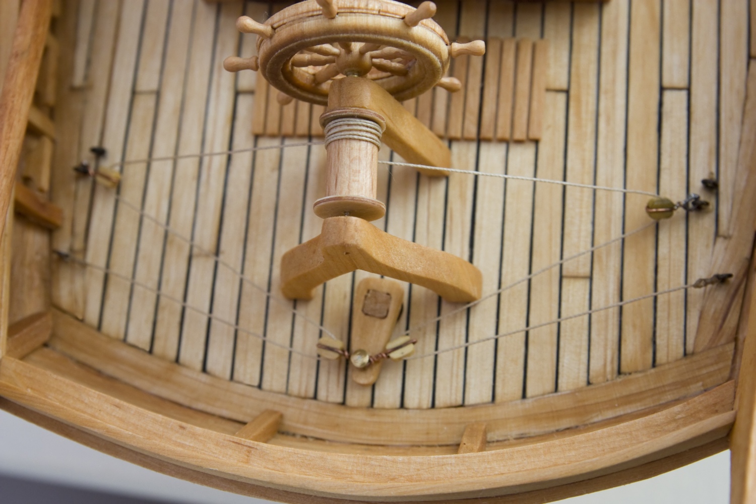 Przekładnie zębate windy kotwicznej i ładunkowej zrobiłem z ryflowanych kołków bukowych Zęby wypiłowałem trójkątnym iglakiem Bulaje i koło sterowe zostały zakupione.