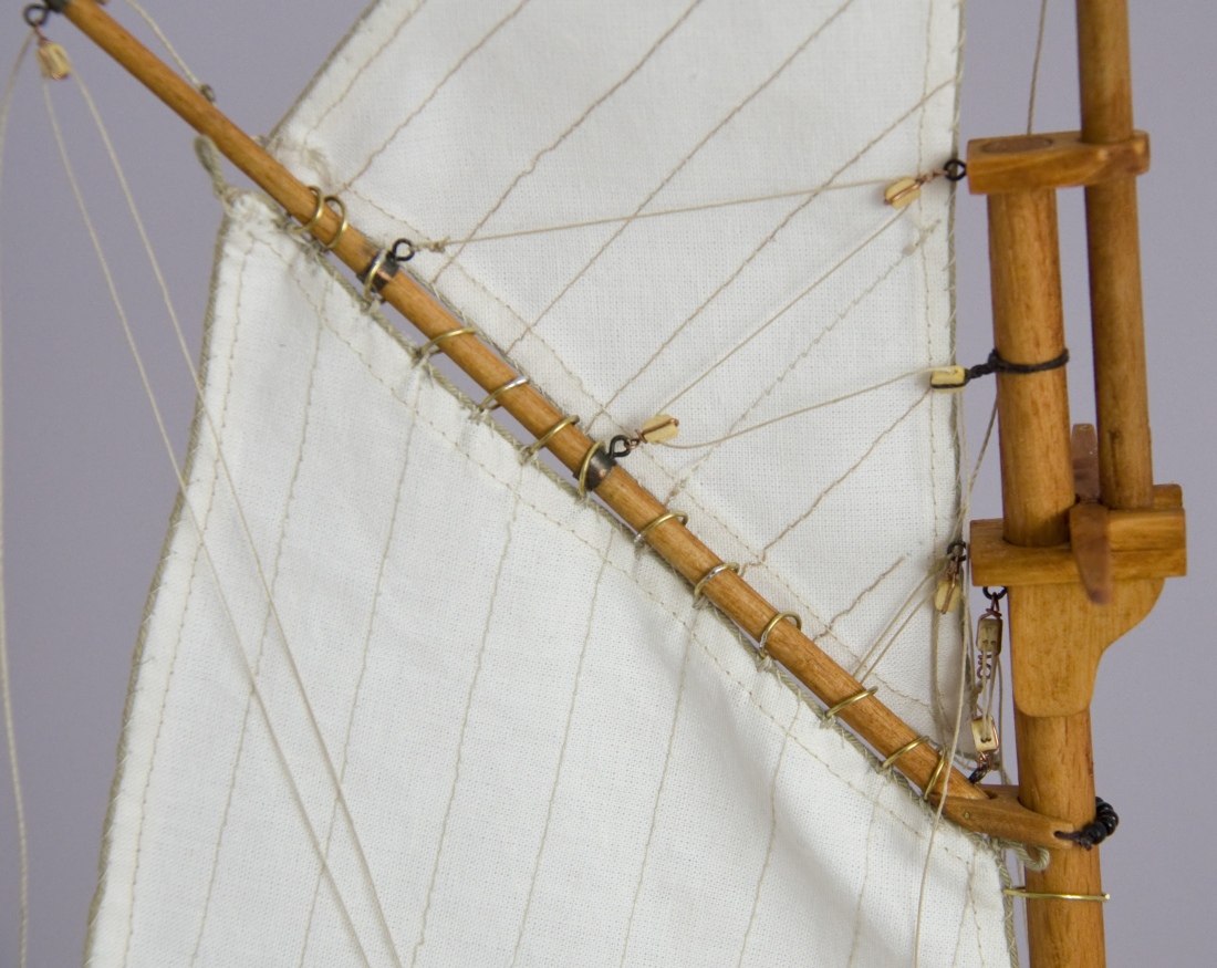 Kolejna próba to nasączenie żagli Caponem. Ta metoda jest dobra do żagli rejowych. Można je wtedy ładnie uformować. Przy dużych żaglach gaflowych wyglądały one jak z kartonu. Ostatecznie krawędzie żagli powinąłem i obszyłem na maszynie. Liklinę przyszyłem na okrętkę Wykonanie na miarę moich umiejętności krawieckich (czyli prawie żadne).