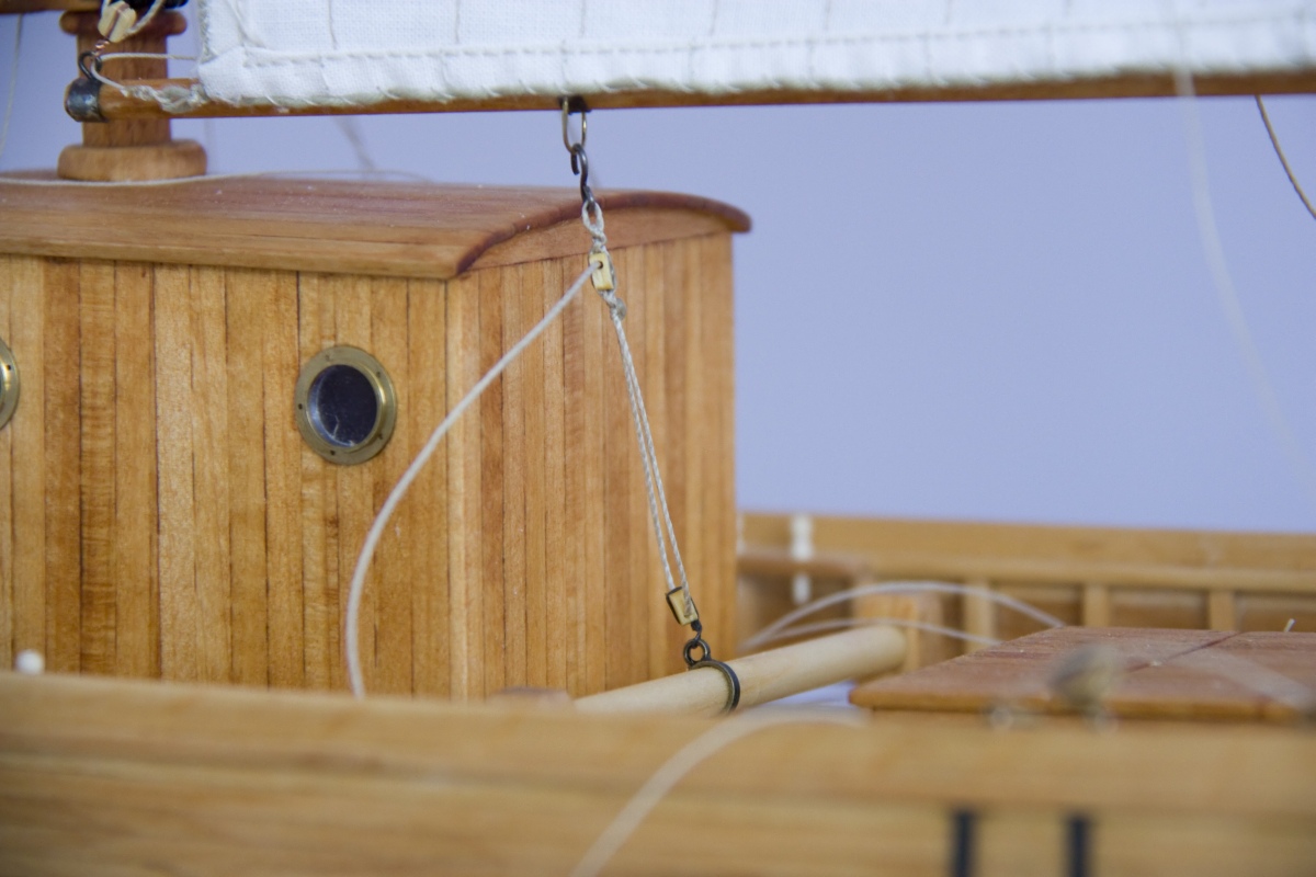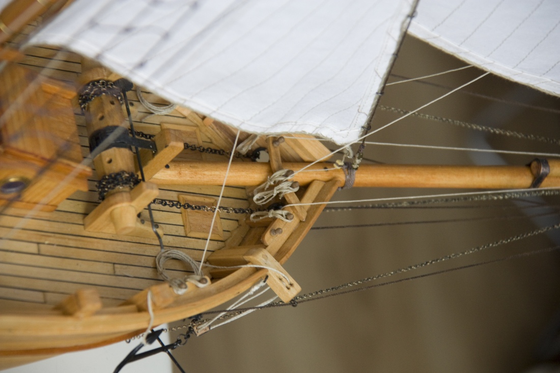 Trochę nietypowy sposób wykonywania olinowania, ale po doświadczeniach z Cutty Sark stwierdziłem, że tak będzie łatwiej. Powiesiłem żagle i zrobiłem olinowanie ruchome bez mocowania lin na stałe. Olinowanie stałe jest tylko wiązane do masztów.