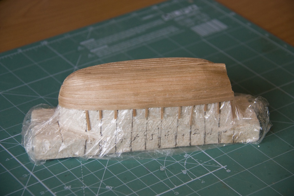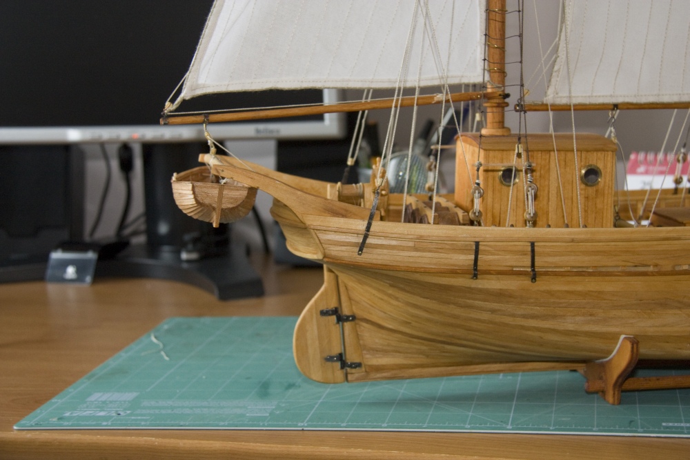Prace zbliżają się powoli do końca. Szalupa zrobiona i powieszona. Miałem kłopot ze zdjęciem szalupy z kopyta. Musiałem je wydłubywać. Dobrze że kopyto było zrobione z balsy, to łatwo się je wydłubało. Jutro będę się zastanawiał jak zrobić flagę.
