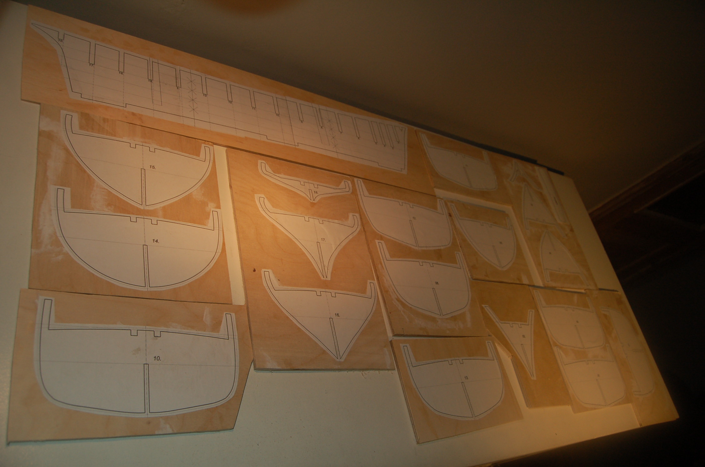 Dżonka skńczona, więc czas zrobić kolejny krok. Miała być Santa Maria, w technice kartonowo - fornirowej. Jednak namówiony przez kolegę Szymonsa rozpoczynam budowę K&M - nareszcie całkowicie drewniany projekt :D. Jeśli się uda, poszycie zrobię jednowarstwowe, jeśli nie podołam będę ratował się fornirem. Na początek powstała stocznia. Następnie nakleiłem na sklejkę 4 i 6 mm części szkieletu i wstępnie pociąłem na kawałki, co ułatwi wycinanie wręg na wyrzynarce stołowej.