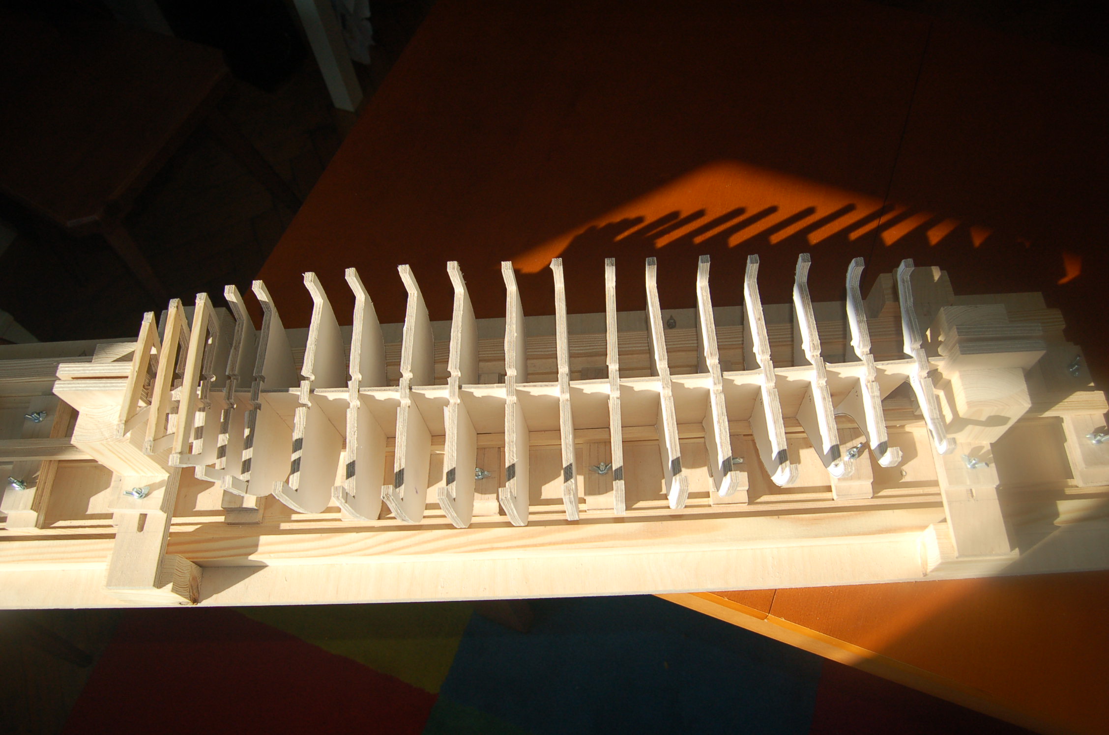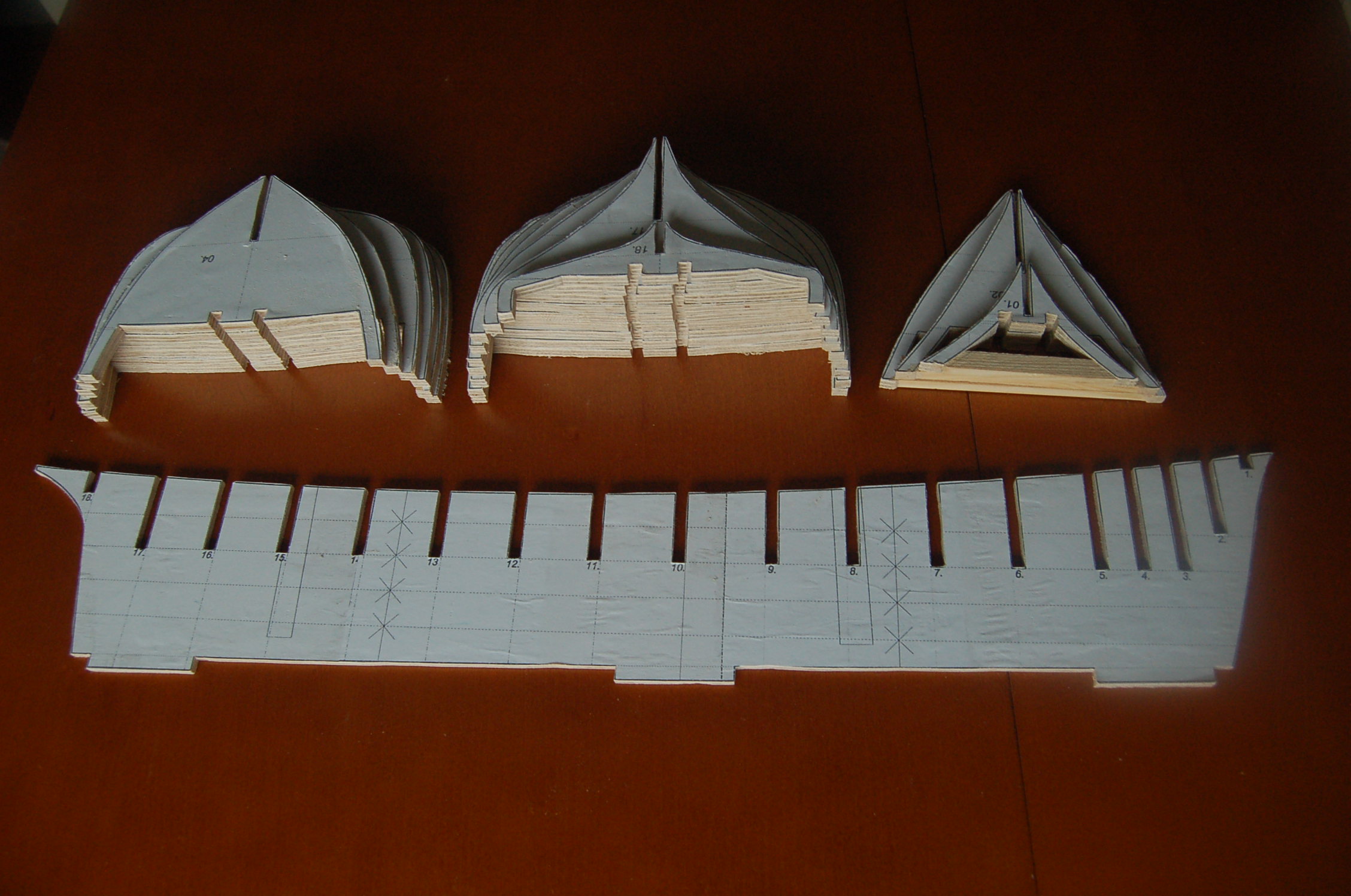 Poskładanie szkieletu w całość okazało się dość pracochłonne - wycięte według planów otwory okazały się zbyt wąskie i trzeba je było powiększać przez szlifowanie. Pierwsza przymiarka wygląda tak jak na zdjęciach. Części szkieletu są spasowane bez żadnego luzu, więc pewnie czeka mnie jeszcze trochę szlifowania przy dokładnym wklejaniu wręg:)
