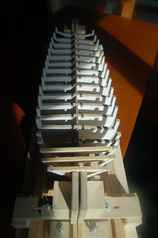 Od ostatniego wpisu minęło trochę czasu. Wiosna, czas remontów nie sprzyja modelarstwu. Wyższe temperatury pozwoliły mi jednak urządzić się w garażu i tak już zostanie:). Dzięki temu powoli ruszają prace, dopasowania wręg i wypoziomowania oraz sprawdzenia kąta prostego między uchwytem śródokręcia, a podstawą stoczni. Klejenie szkieletu, wypełnienie dziobu i rufy, oraz szlifowanie w kolejnych postach.