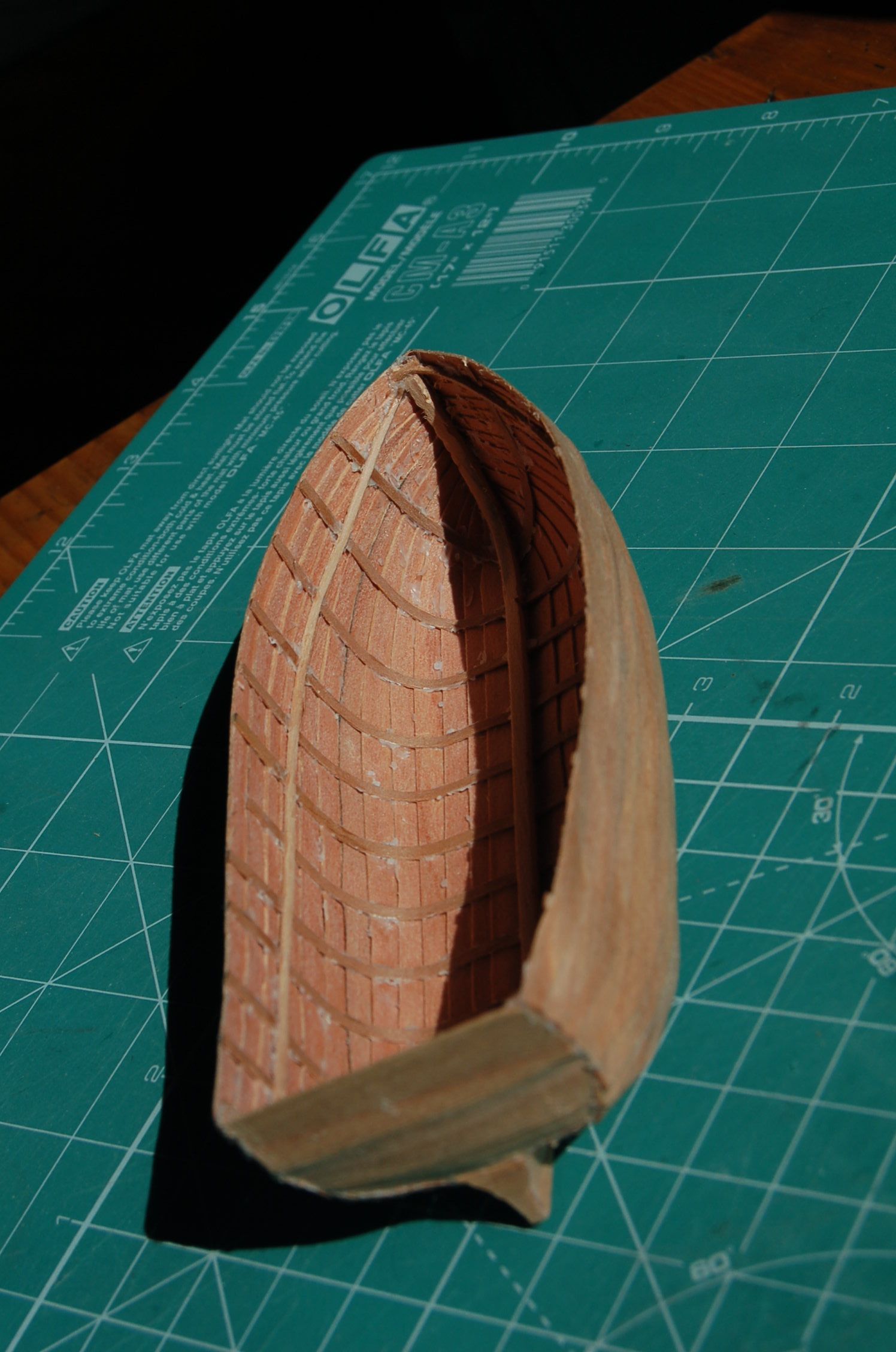 Mam nadzieję, że poprawiłem wręgi pierwszą i ostatnią? Szalupa jest szkoleniowa, a celem jej budowy jest nauka na błędach. Już teraz widzę, że przy docelowej muszę lepiej wyprofilować kopyto w części rufowej.