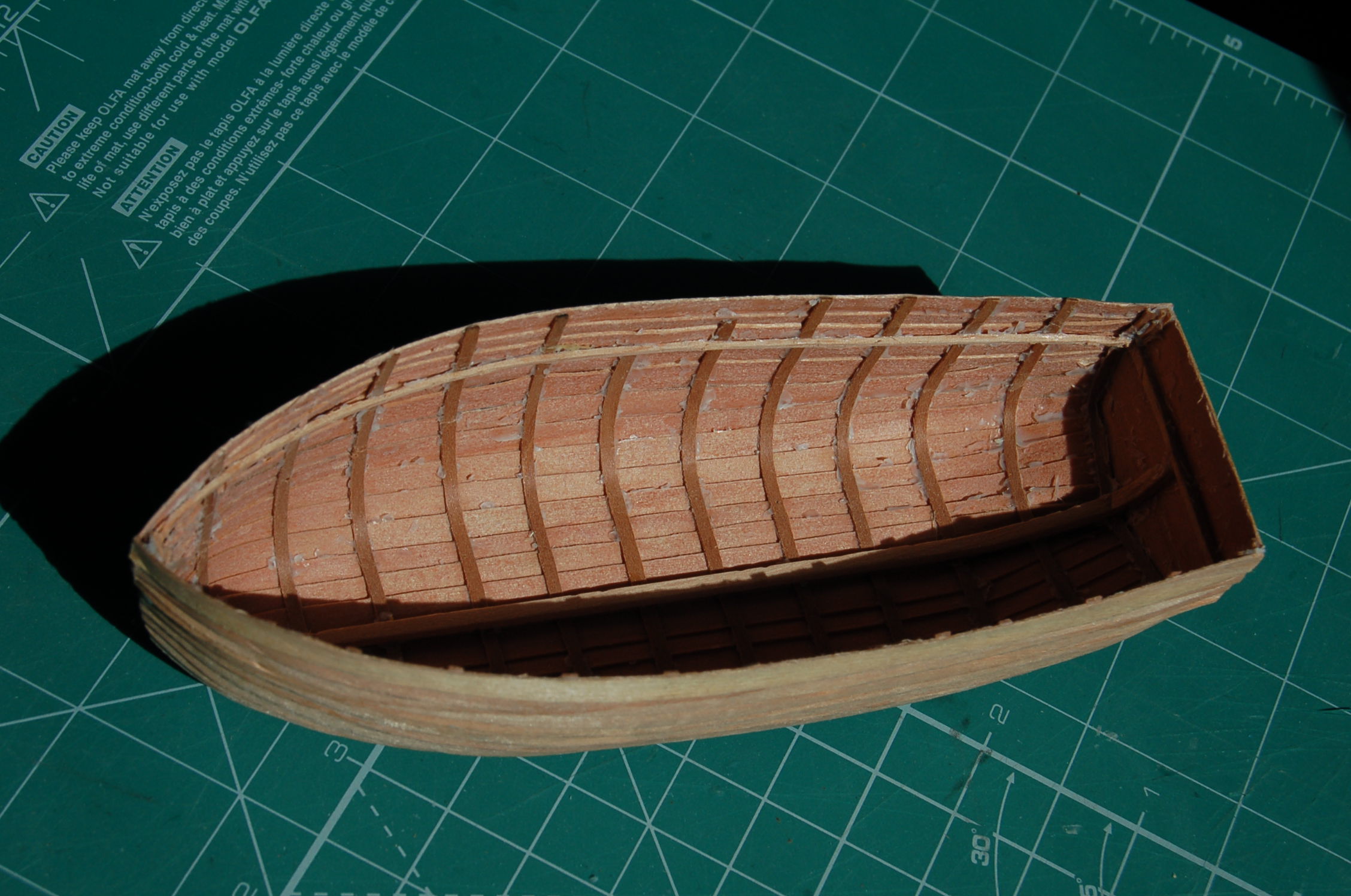 Poszywanie szalupy zostało ukończone. Pierwszy problem jaki napotkałem,to zdjęcie jej z kopyta, co zakończyło się małymi uszkodzeniami. Drugi to wnętrze zapaćkane wikolem, którego naddatki wypłynęły przy klejeniu. Pomimo tego szalupa zostanie ukończona w celu nabierania doświadczenia.