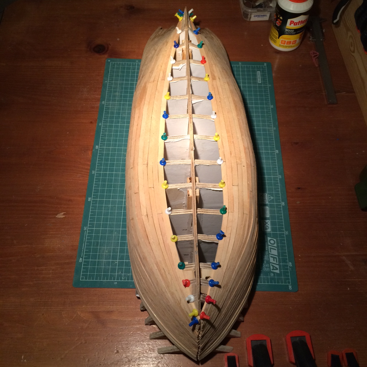 Dziękuję, za cenne uwagi. Górne listwy poprowadzone zostały w linii pokładu. Minimalnie na dziobie zadzierają nosa, ale będzie to skorygowane. Cały kadłub podzielony na trzy równe części. Teraz czas na wklejenie listew i kolejne planki.
