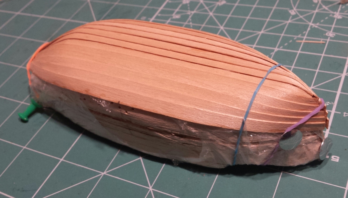 Rozpocząłem budowę szalupy. Kopyto wystrugałem z balsy. Fornir to olcha. Planki przyklejam klejem CA średnio gęstym. Wręgi planowałem przykleić dopiero po wyjęciu z kopyta. Ale już widzę, że brakuje ich na dziobie i rufie. Poza tym za mało zwężałem planki na dziobie i bardzo możliwe, że szalupa wyląduje w piecu :-)