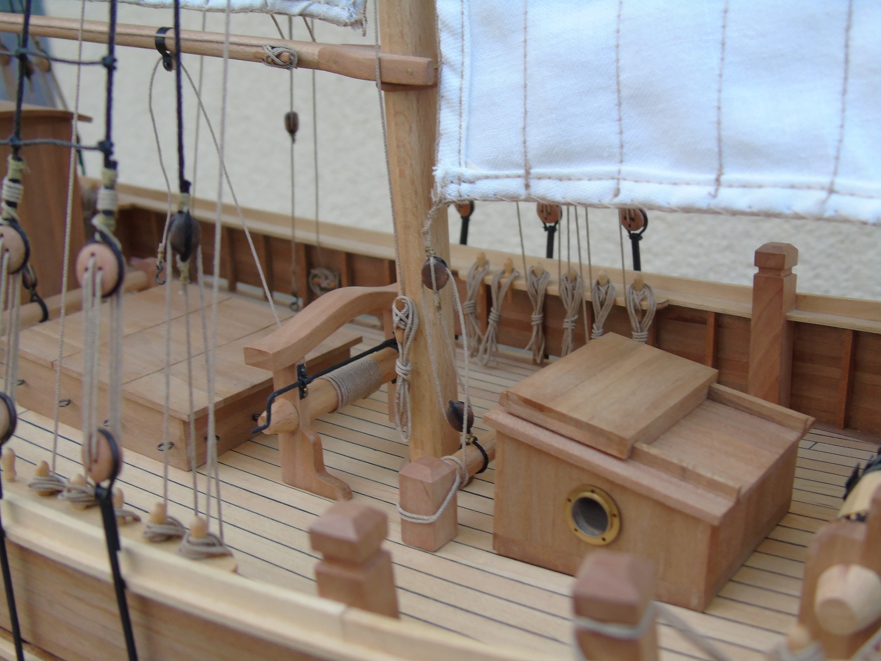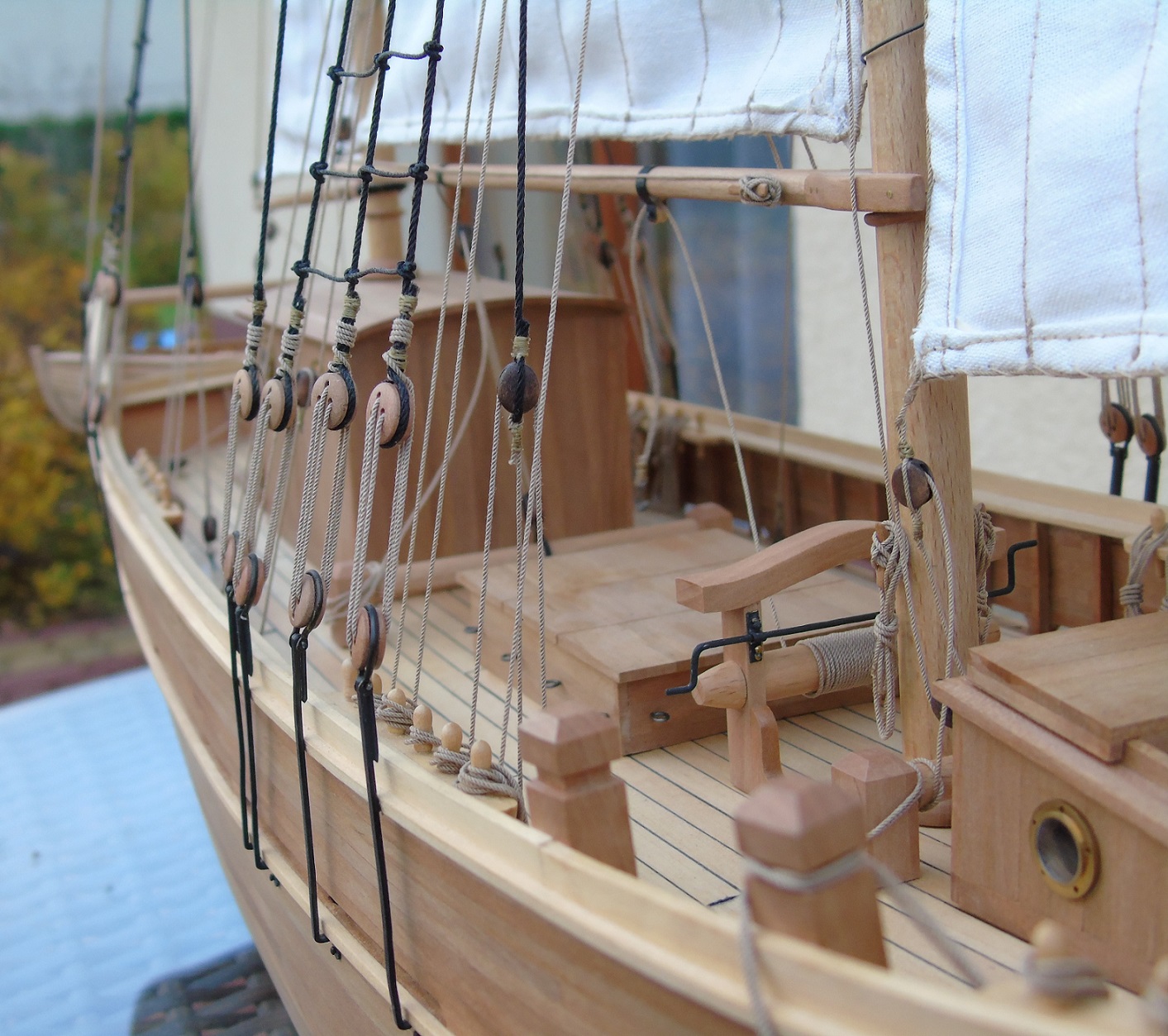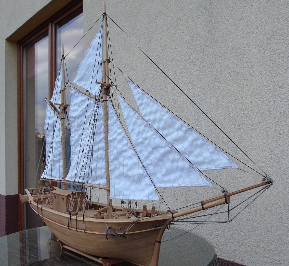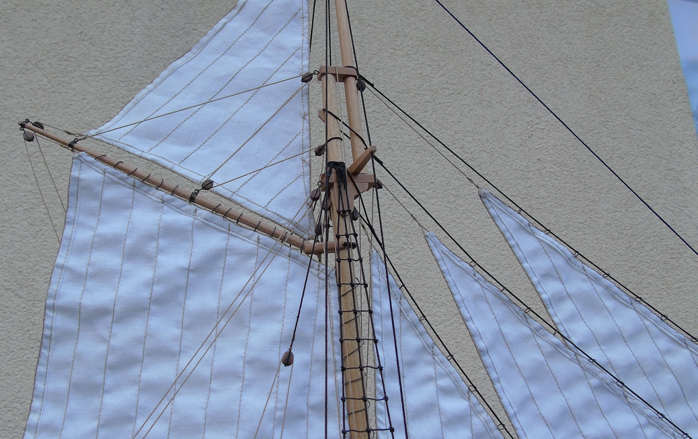 Na gotowym płótnie przykleiłem papier z narysowanymi żaglami podobnie jak wykonał to Prabut. Niestety użyłem papieru milimetrowego, który jest stosunkowo gruby. Miałem przez to problem z oderwaniem go po przeszyciu. Samo szycie wykonała znajoma krawcowa. Niestety nie posiadam maszyny do szycia. Liklinę przeszyłem ręcznie na okrętkę. Wszystkie żagle są już powieszone i większość linek już zawieszona. Poniżej kilka zdjęć, może komuś się to przyda. Niestety są słabo doświetlone a nie chce używać lampy. Jak będzie słonecznie i znajdę czas to zrobię kilka lepszych zdjęć.