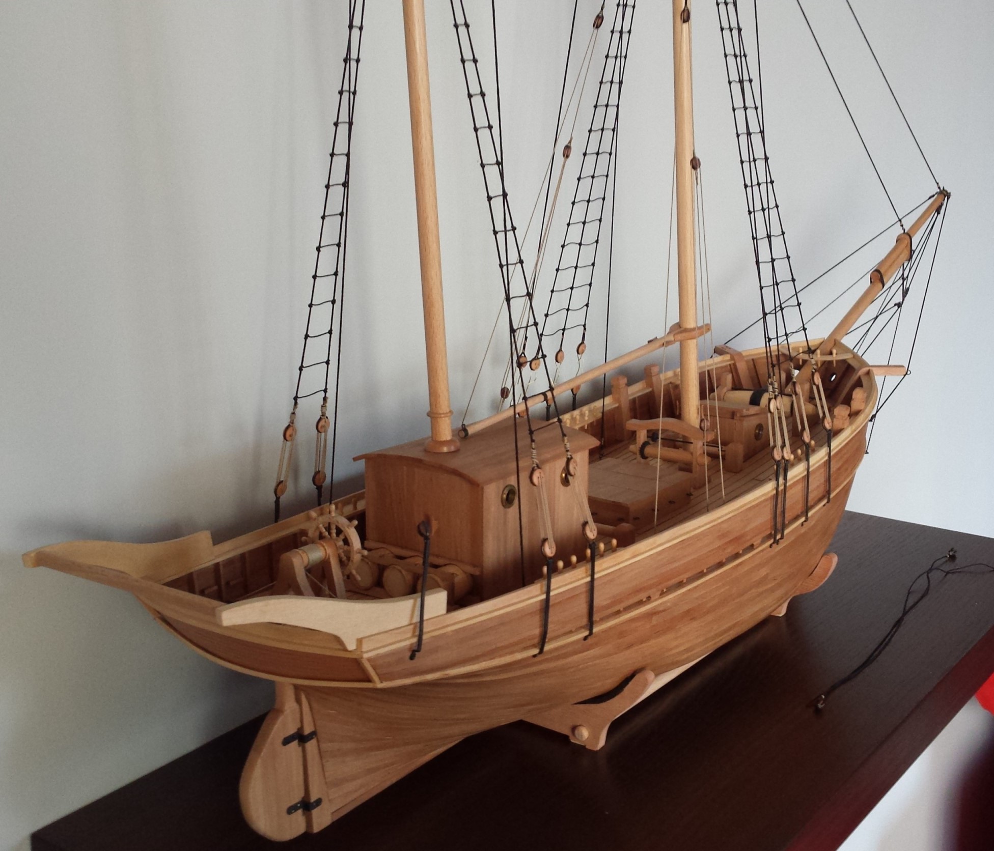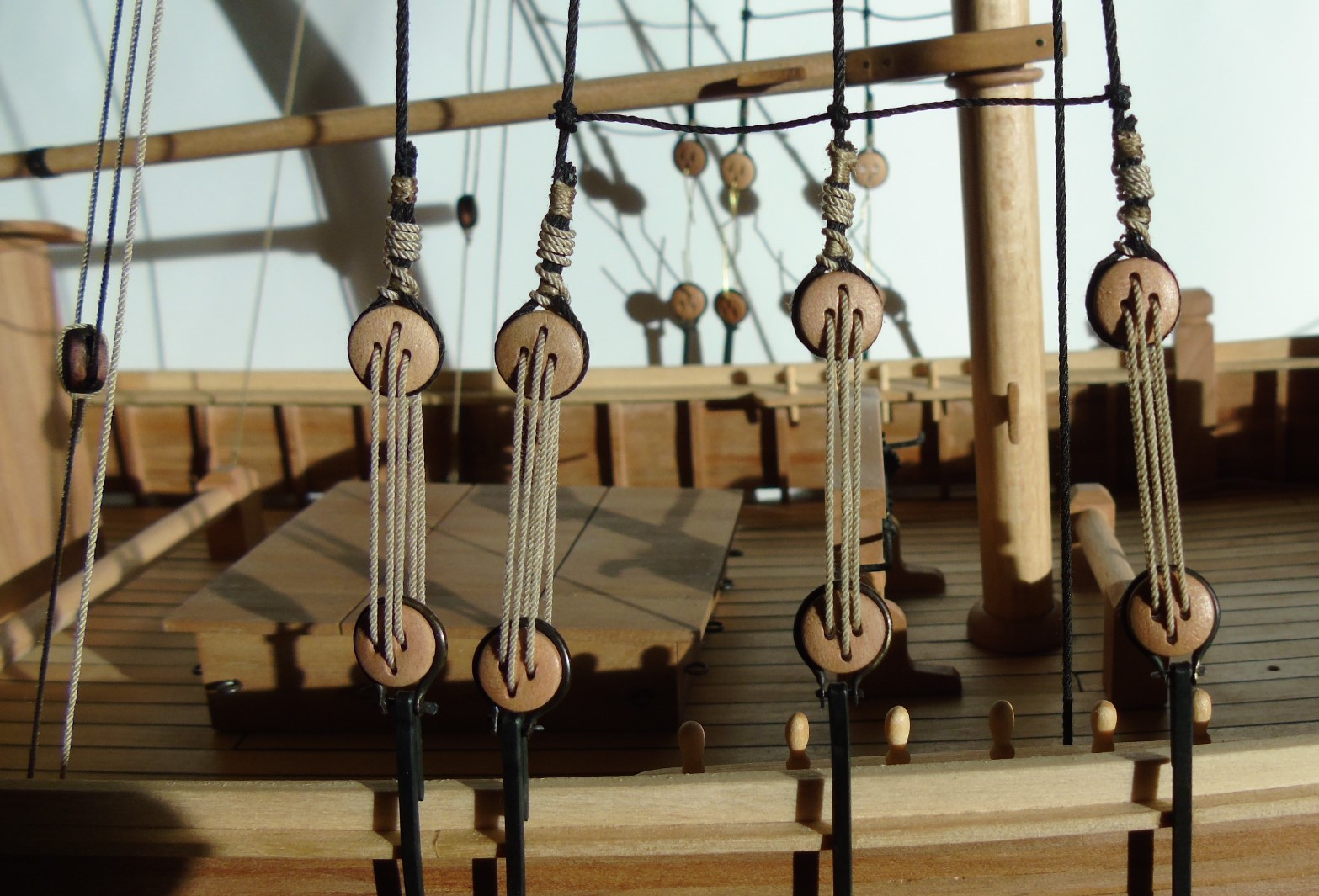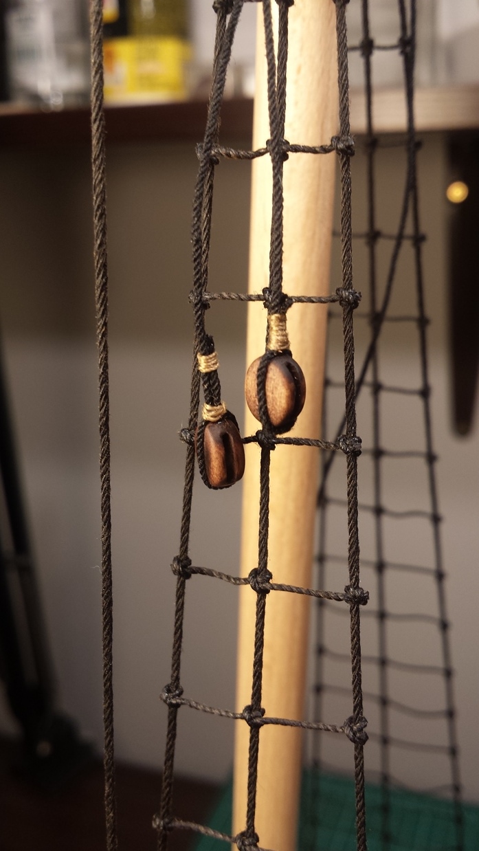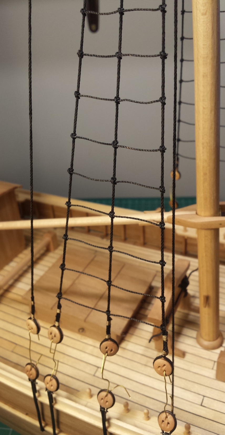 Pozostało jeszcze wykonać kilka sznurków na zwoje lin. Jak dotąd na olinowanie ruchome (łącznie z próbami) zużyłem szpule 500m nici 120. Pojedyncza lina skręcana jest z sześciu nitek (3x2).