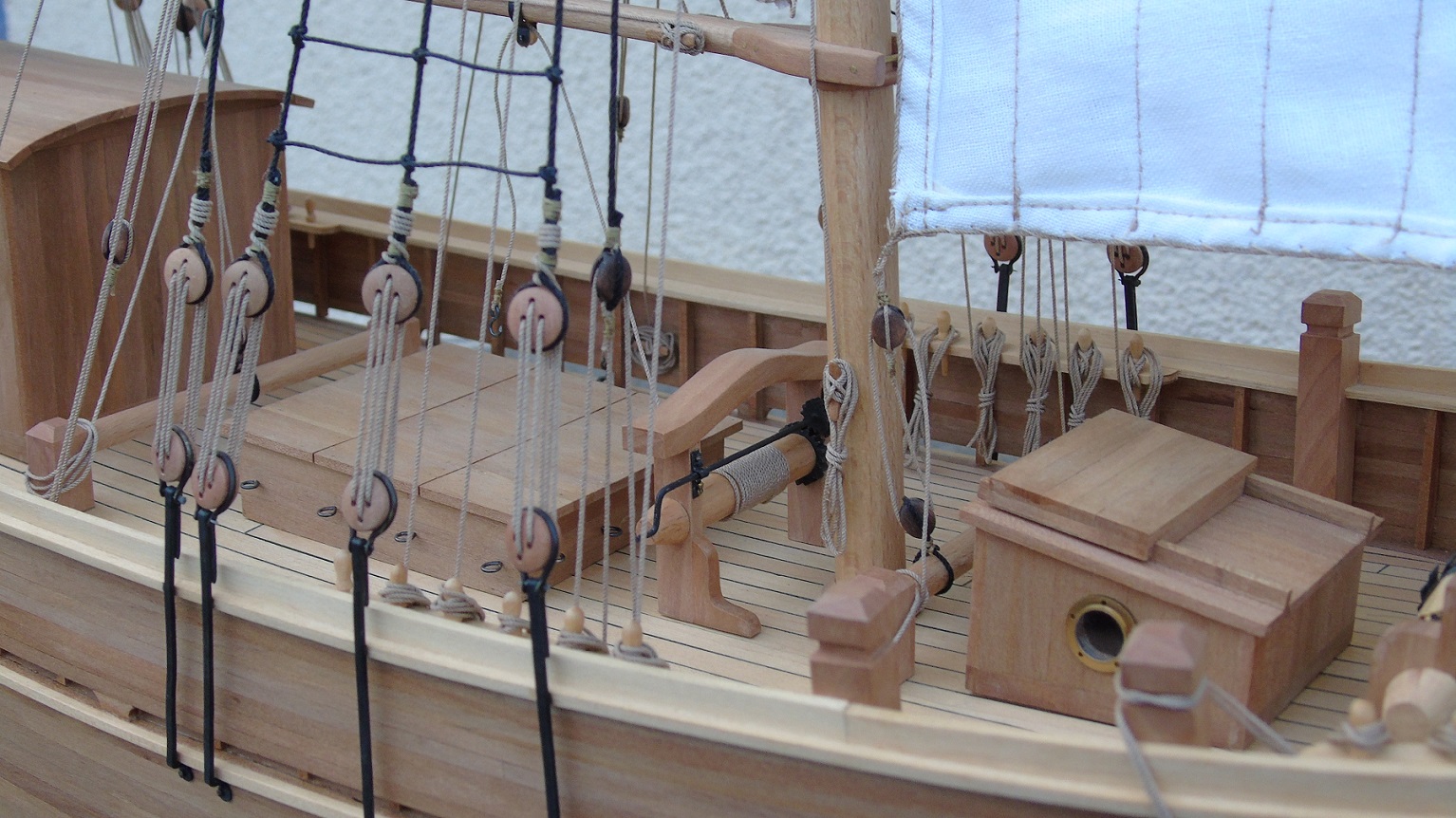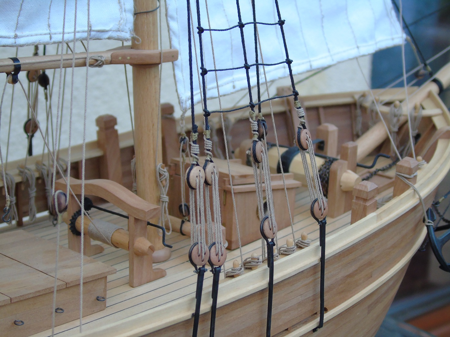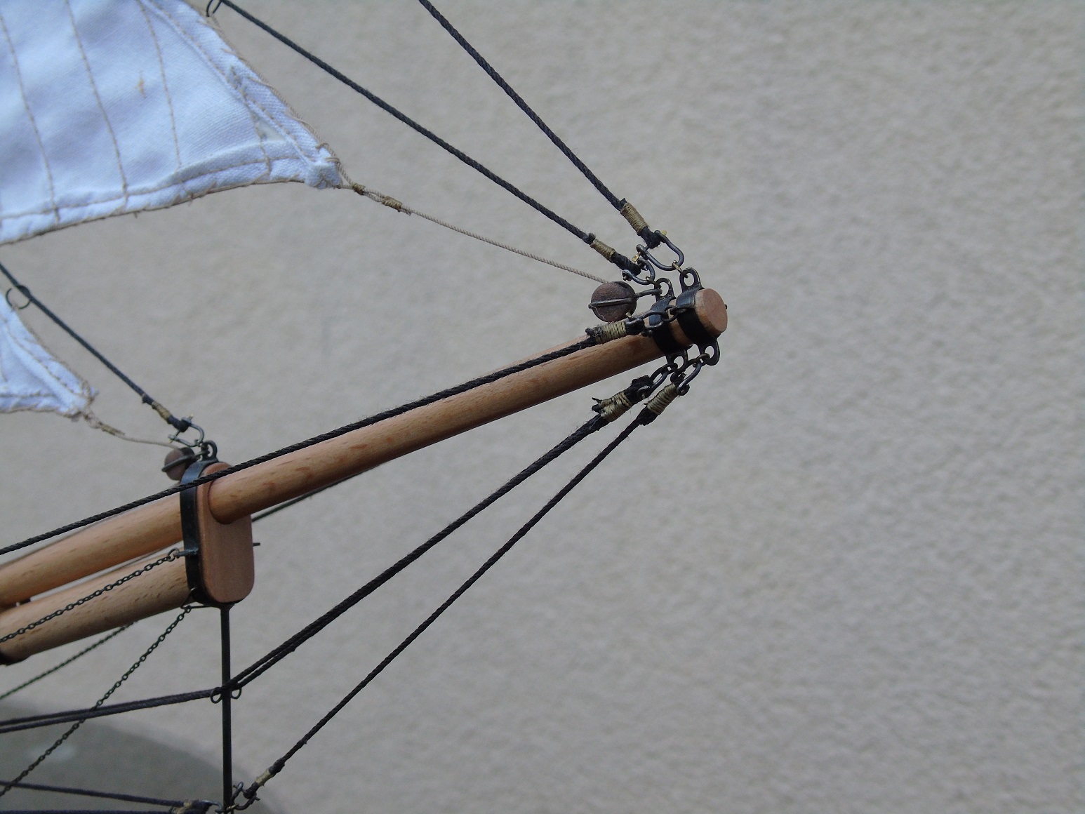 Na gotowym płótnie przykleiłem papier z narysowanymi żaglami podobnie jak wykonał to Prabut. Niestety użyłem papieru milimetrowego, który jest stosunkowo gruby. Miałem przez to problem z oderwaniem go po przeszyciu. Samo szycie wykonała znajoma krawcowa. Niestety nie posiadam maszyny do szycia. Liklinę przeszyłem ręcznie na okrętkę. Wszystkie żagle są już powieszone i większość linek już zawieszona. Poniżej kilka zdjęć, może komuś się to przyda. Niestety są słabo doświetlone a nie chce używać lampy. Jak będzie słonecznie i znajdę czas to zrobię kilka lepszych zdjęć.