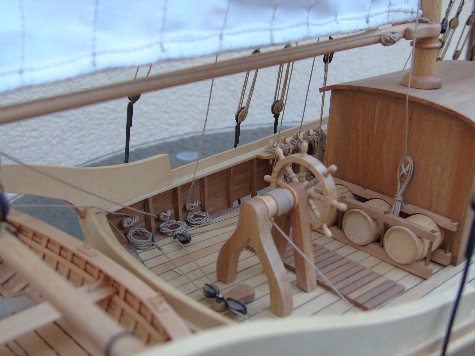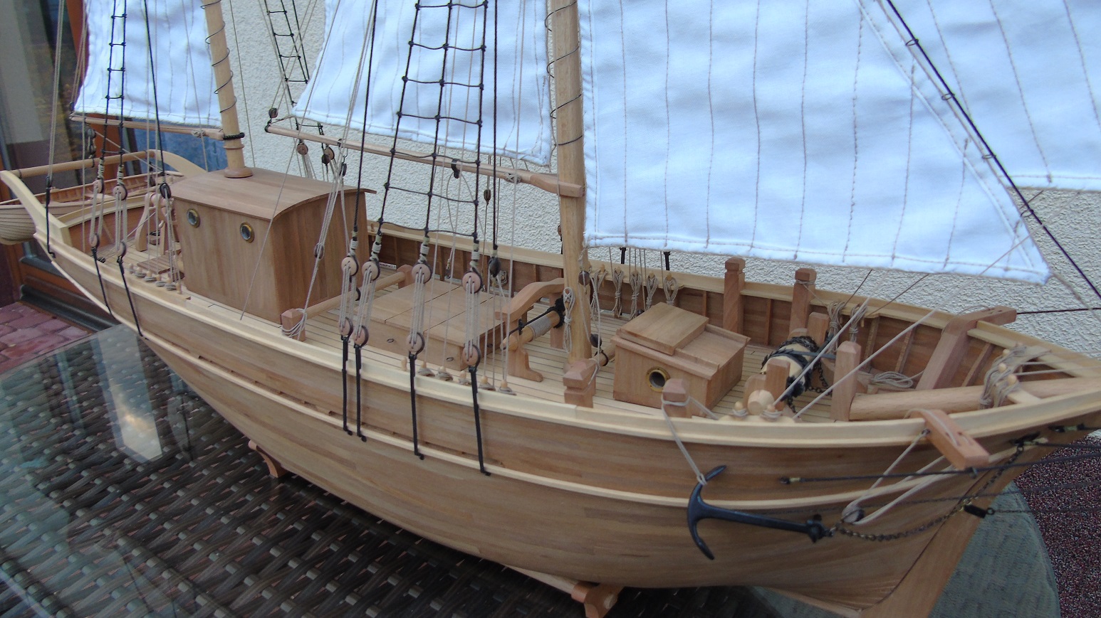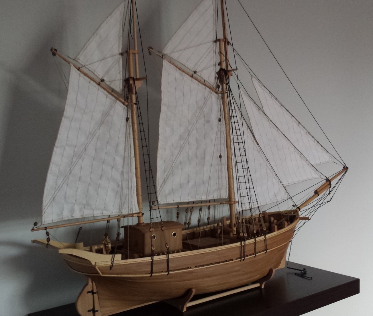 Na gotowym płótnie przykleiłem papier z narysowanymi żaglami podobnie jak wykonał to Prabut. Niestety użyłem papieru milimetrowego, który jest stosunkowo gruby. Miałem przez to problem z oderwaniem go po przeszyciu. Samo szycie wykonała znajoma krawcowa. Niestety nie posiadam maszyny do szycia. Liklinę przeszyłem ręcznie na okrętkę. Wszystkie żagle są już powieszone i większość linek już zawieszona. Poniżej kilka zdjęć, może komuś się to przyda. Niestety są słabo doświetlone a nie chce używać lampy. Jak będzie słonecznie i znajdę czas to zrobię kilka lepszych zdjęć.