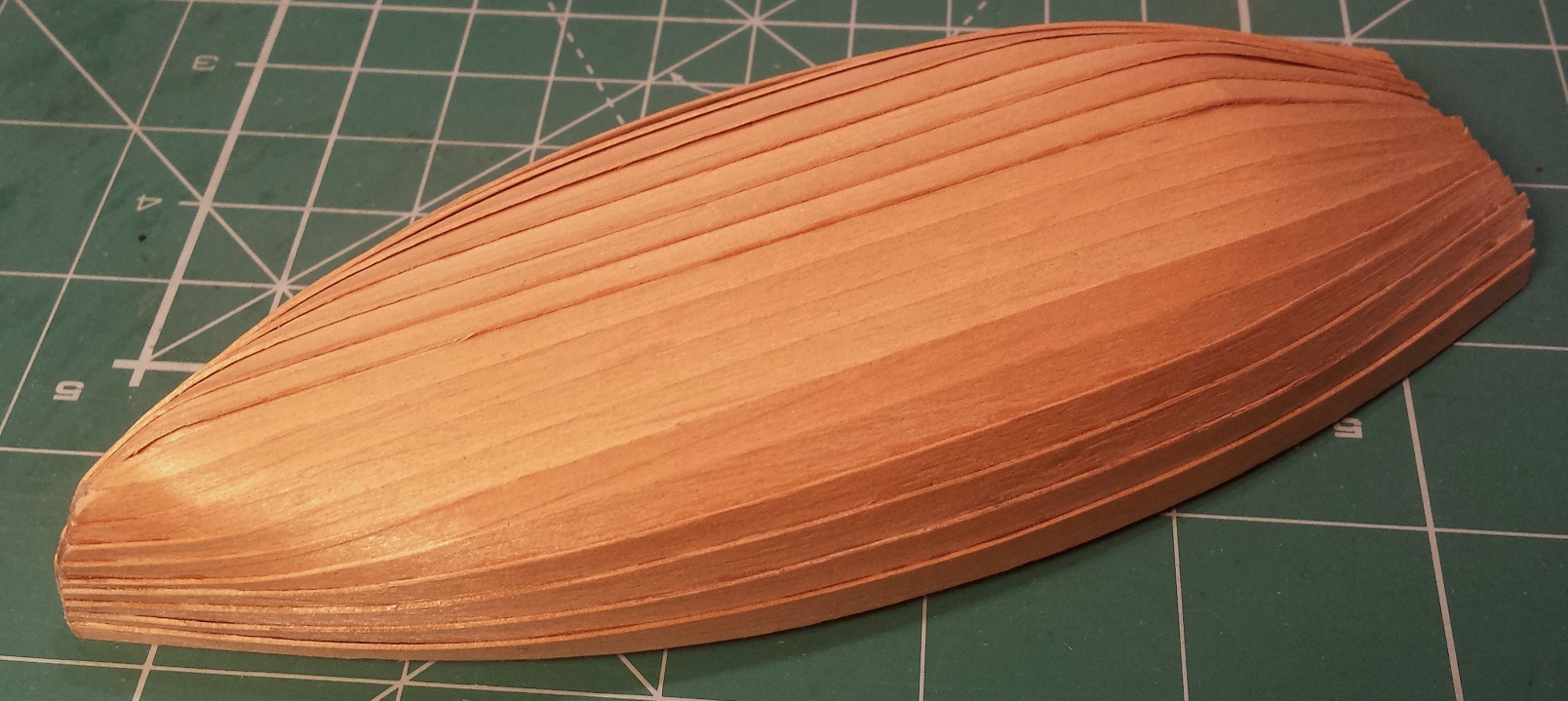 Rozpocząłem budowę szalupy. Kopyto wystrugałem z balsy. Fornir to olcha. Planki przyklejam klejem CA średnio gęstym. Wręgi planowałem przykleić dopiero po wyjęciu z kopyta. Ale już widzę, że brakuje ich na dziobie i rufie. Poza tym za mało zwężałem planki na dziobie i bardzo możliwe, że szalupa wyląduje w piecu :-)