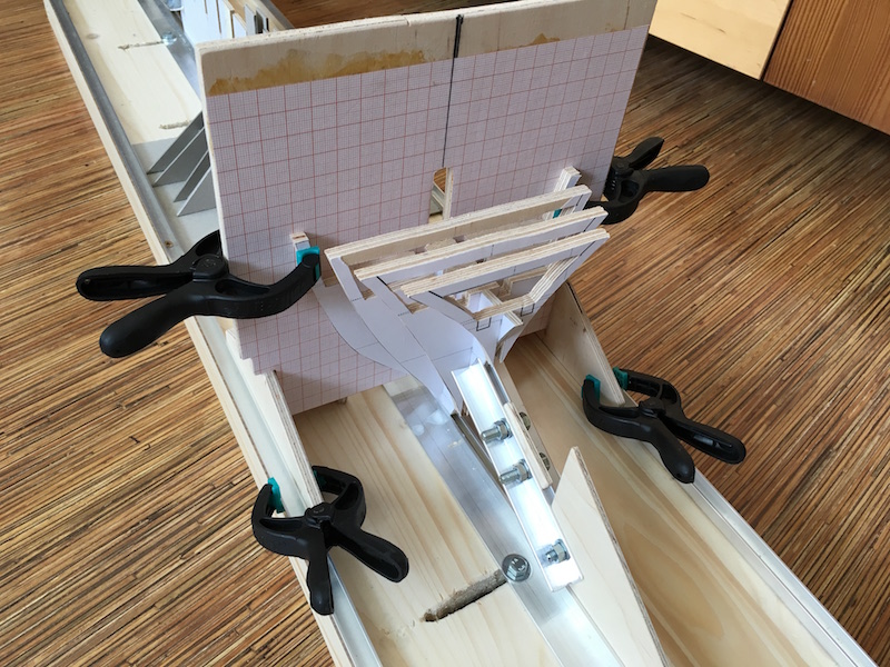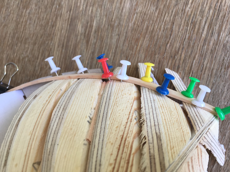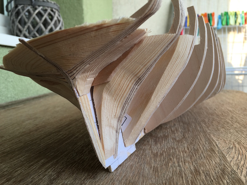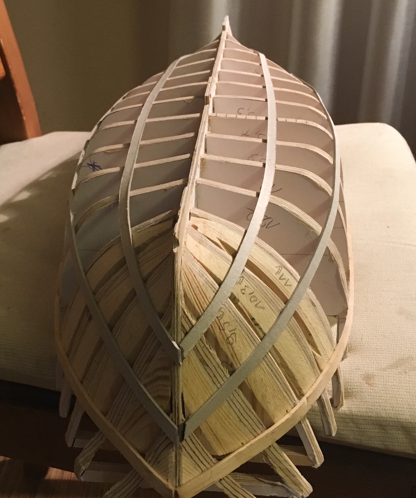 Witam, przykleiłem battens'y z tekturki 1mm. Długości wręg mierzyłem paskiem z papieru milimetrowego i dzieliłem je na 3 równe odcinki. Wyznaczone punkty połączyłem poszczególnymi paskami tektury. Teraz pomalutku będę dopasowywać listewki poszycia.