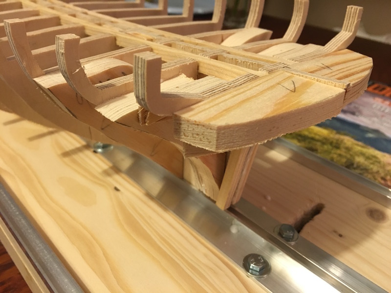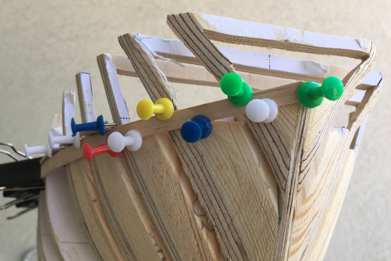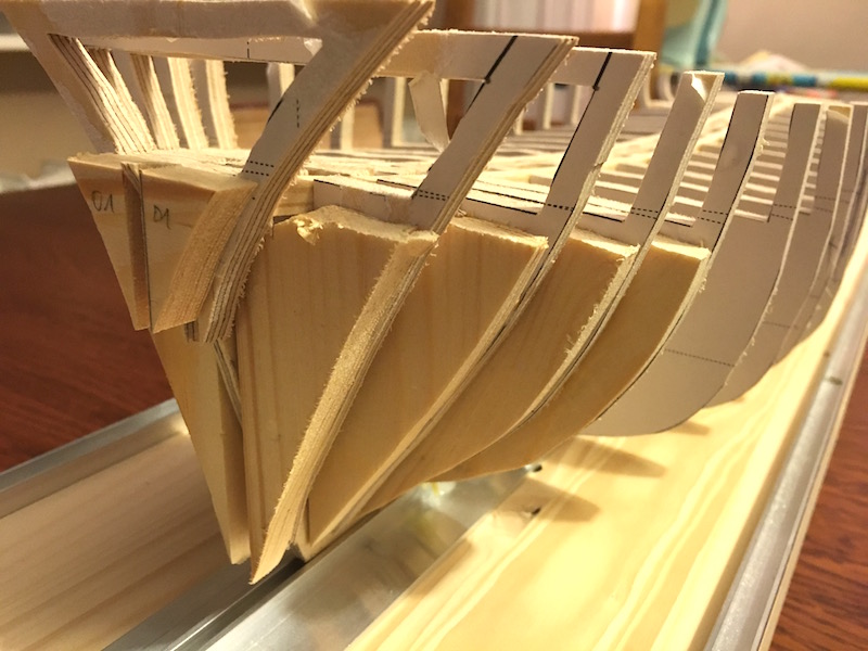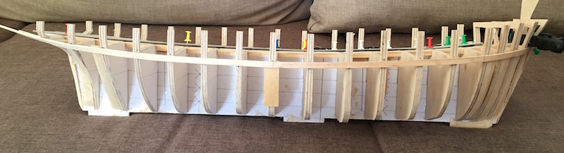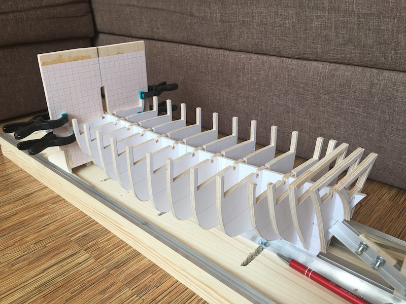 Obecnie jestem na etapie budowy szkieletu - zostały mi 2 wręgi do wklejenia. Potem listewki wzmacniające szkielet, wypełnienie rufy i dziobu oraz szlifowanie tego wszystkiego.