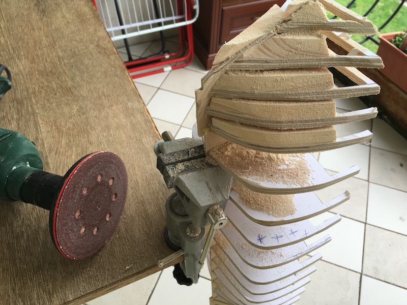 Pierwsze Koty za płoty jeśli chodzi o szlifowanie. Wstępnie przeszlifowałem wypełnienia na dziobie i rufie, oraz wszystkie wręgi szkieletu. Na dziobie i rufie pomogła mi wiertarka z kółkiem szlifierskim i faktycznie trzeba robić to czujne, żeby nie przeszlifować wręg.