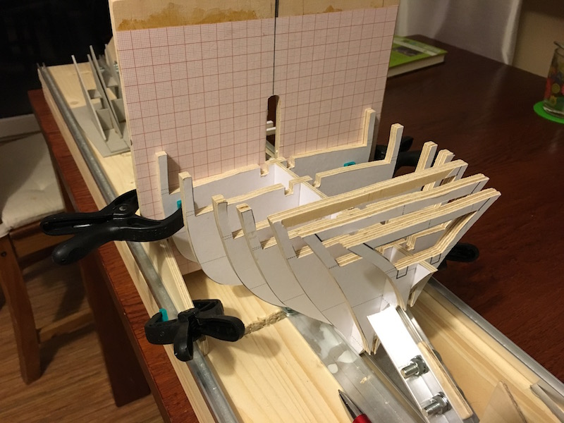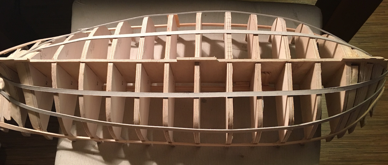Obecnie jestem na etapie budowy szkieletu - zostały mi 2 wręgi do wklejenia. Potem listewki wzmacniające szkielet, wypełnienie rufy i dziobu oraz szlifowanie tego wszystkiego.