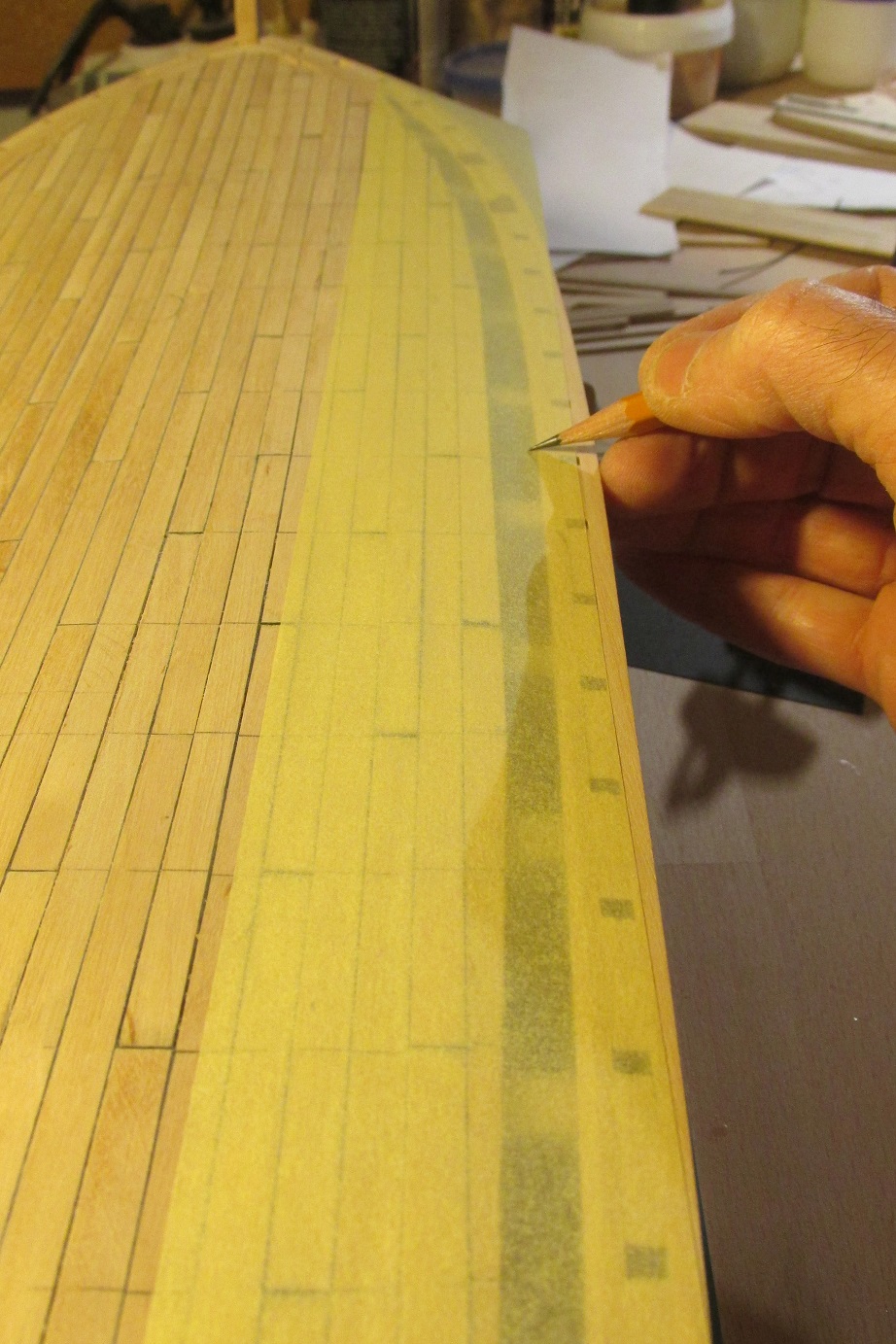 Panowie, nie ma się co spierać o swoje. Ten wzór na mym "Victorym", to jest tzw. 4:1, tj. połączenie między plankami występuje na co 4tej plance, czyli między sąsiadującymi połaczeniami są dokładnie trzy całe planki (tak wybrałem). I to sie powinno powtarzać. Im większa jednostka, tym więcej tych litych planek między połączeniami - taka była zasada. Ale tylko największe olbrzymy, np. "Santisima Trinidad" mogły mieć cztery ciągłe planki między połaczeniami, reszta raczej trzy.