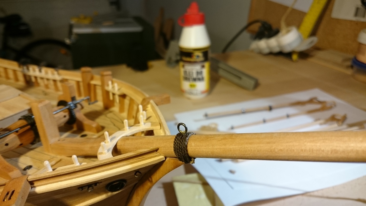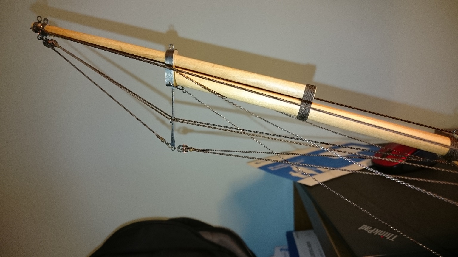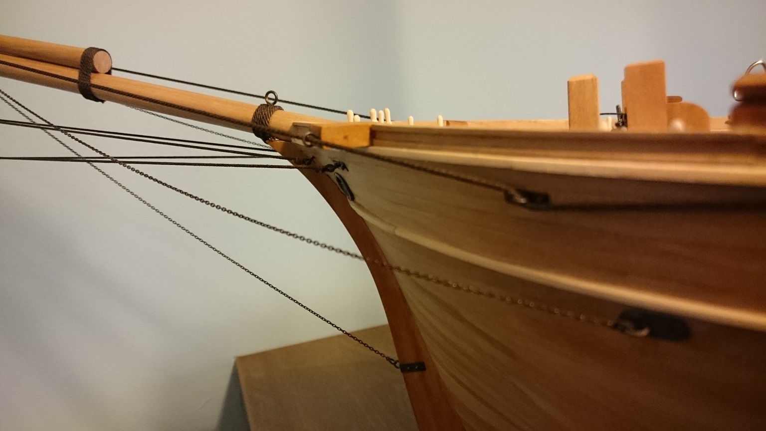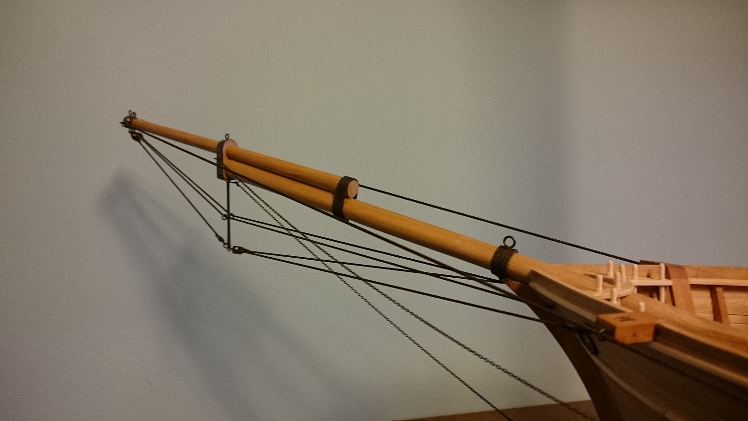 Kolumny masztów wklejone. Przyszedł czas na linki. Muszę powiedzieć, że linki impregnowane w miksturze Mirka są fantastyczne. Wygląd wiadomo, ale wiązanie ich jest bardzo przyjemne:-) Olinowanie bukszprytu z linek z 12 nitek, a watersztag (chyba tak się to nazywa) z linek z 18 nitek.