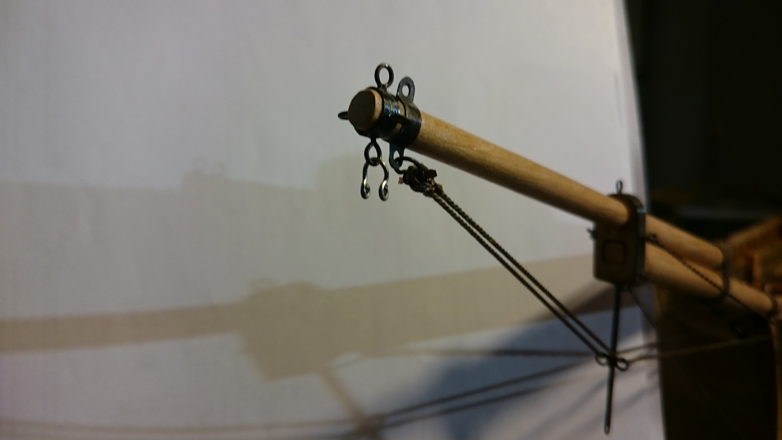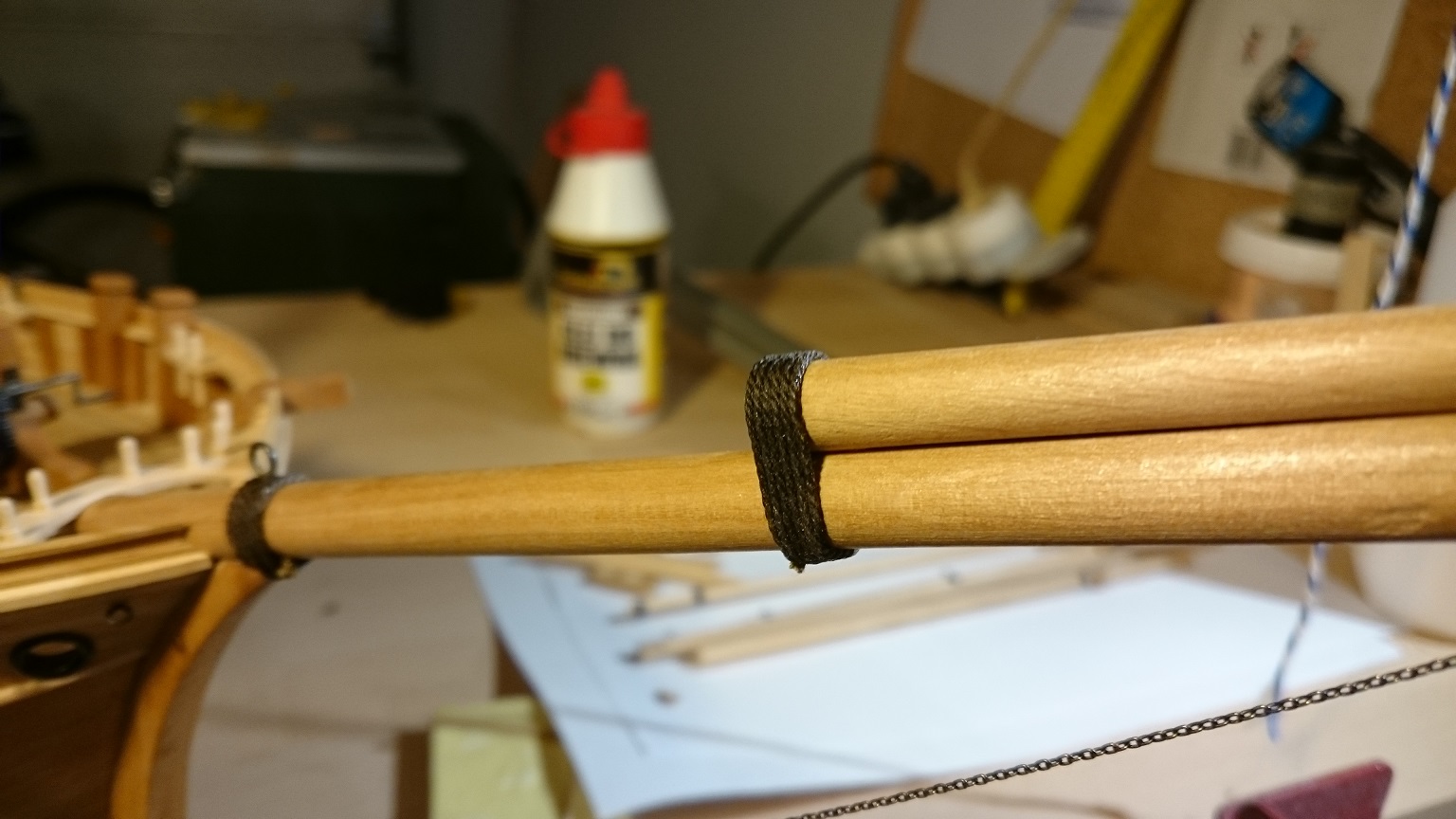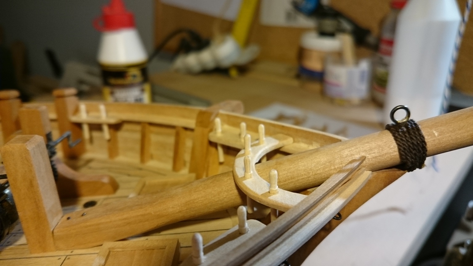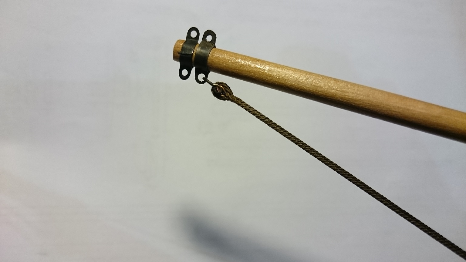 Kolumny masztów wklejone. Przyszedł czas na linki. Muszę powiedzieć, że linki impregnowane w miksturze Mirka są fantastyczne. Wygląd wiadomo, ale wiązanie ich jest bardzo przyjemne:-) Olinowanie bukszprytu z linek z 12 nitek, a watersztag (chyba tak się to nazywa) z linek z 18 nitek.