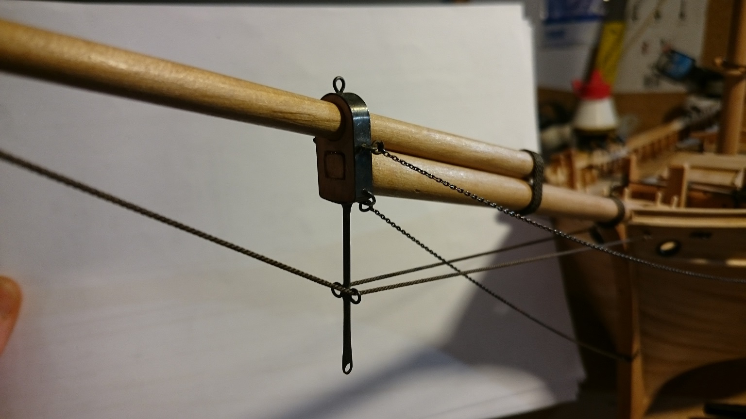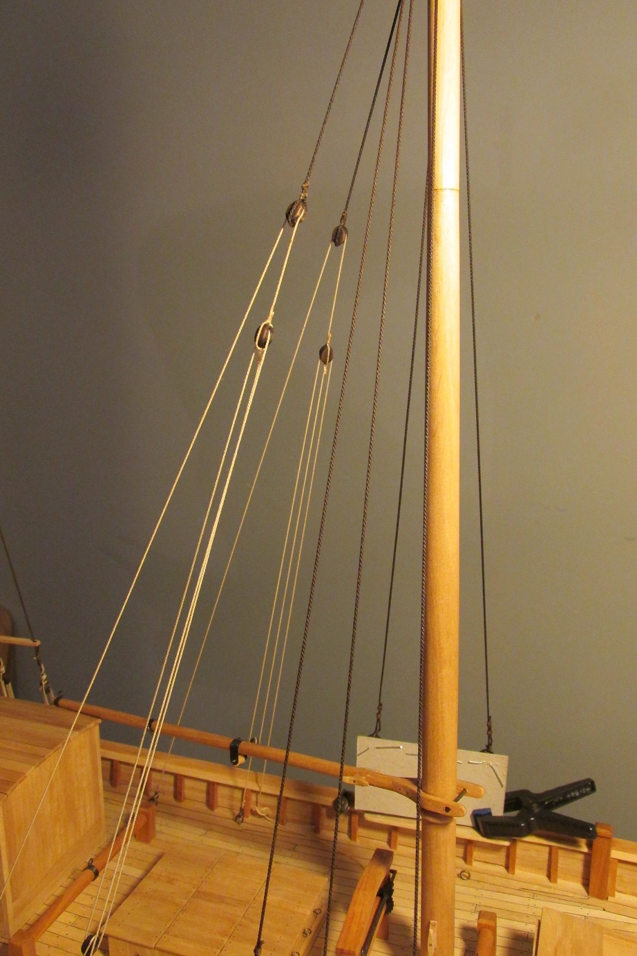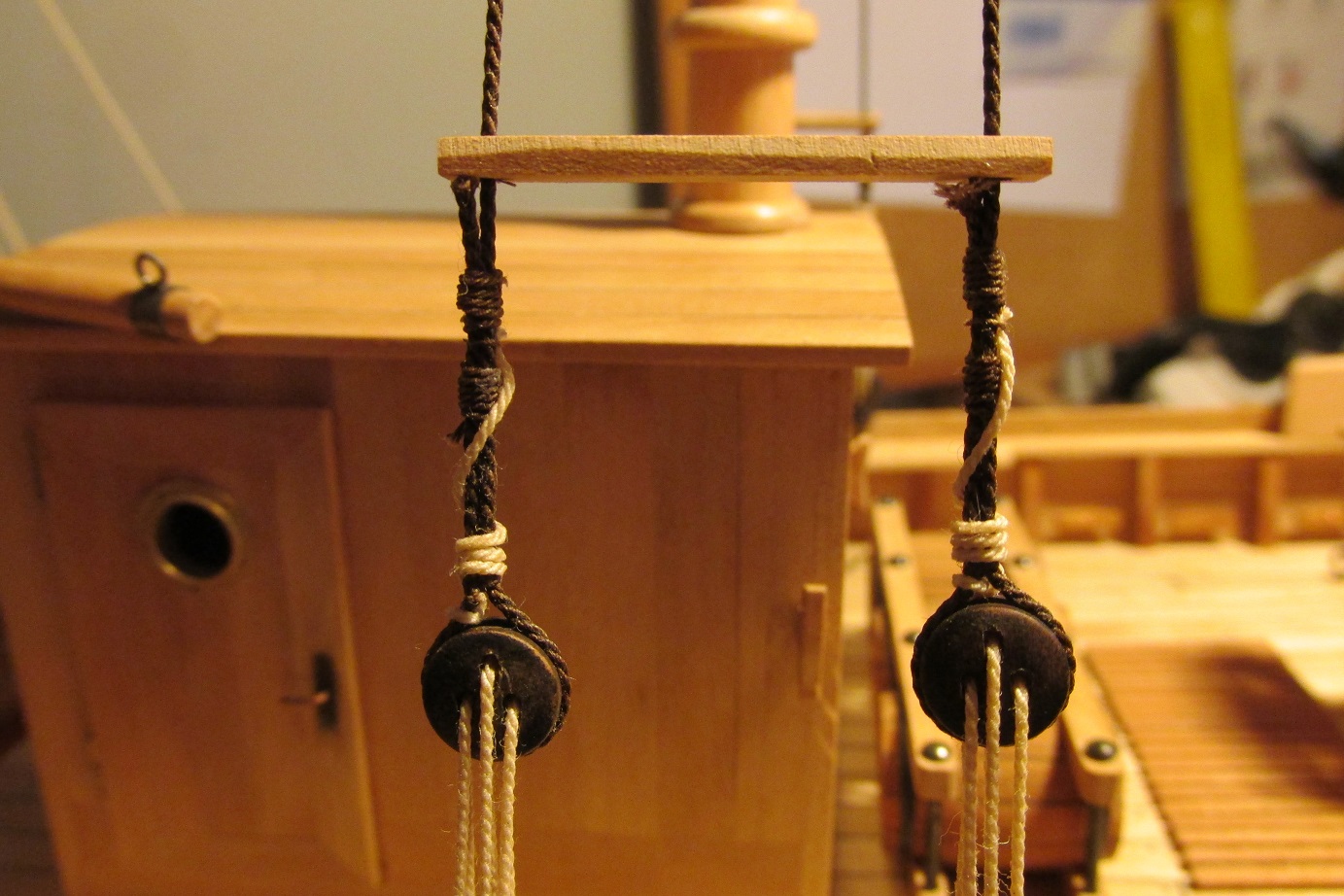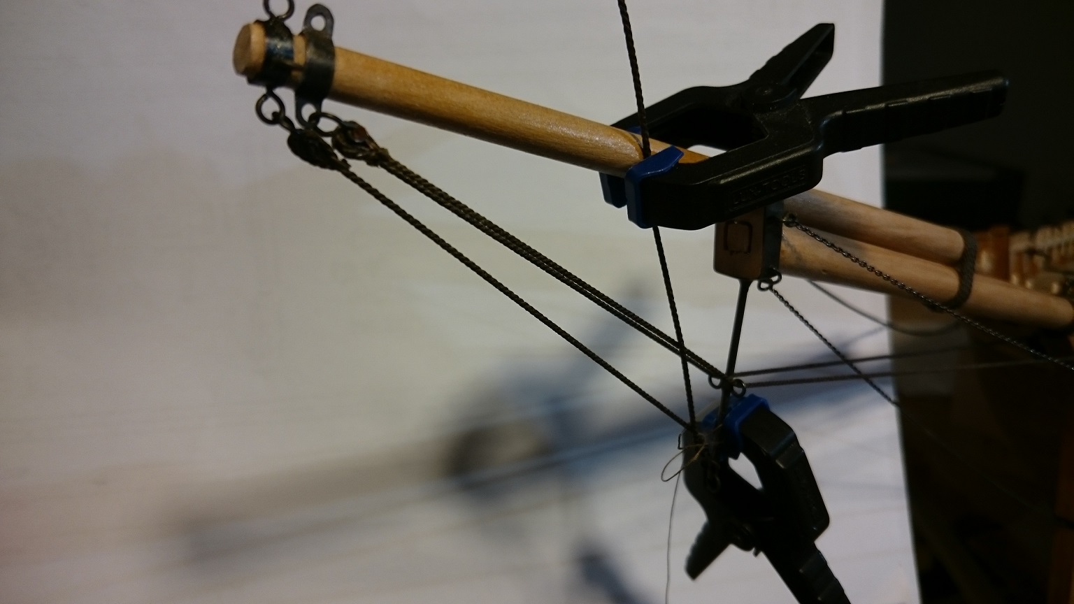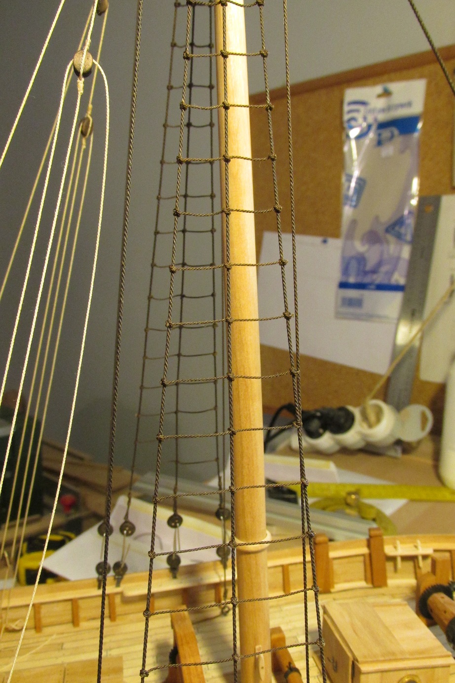 Kończę powoli olinowanie stałe. Kolejnym etapem będzie szalupa, w ramach odpoczynku od linek. Ponieważ nie zdawałem sobie sprawy jak dużo liny trzeba zużyć żeby coś powiązać, ropewalk chodzi prawie na okrągło.Liny grotmaszt - bukszpryt na razie tylko związane bez podklejenia i odcinania owijek, to tak na wszelki wypadek, na ostatni etap naciągania.