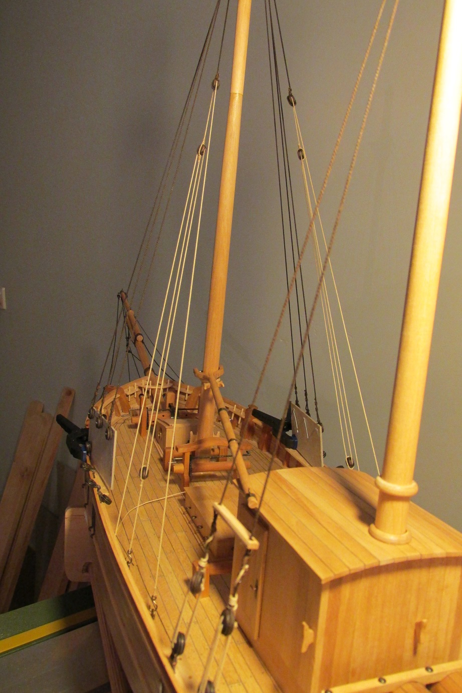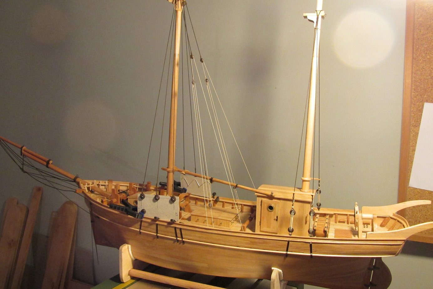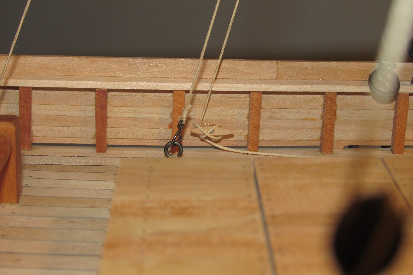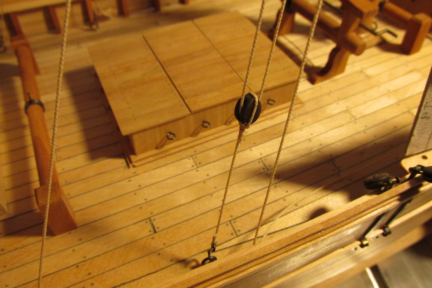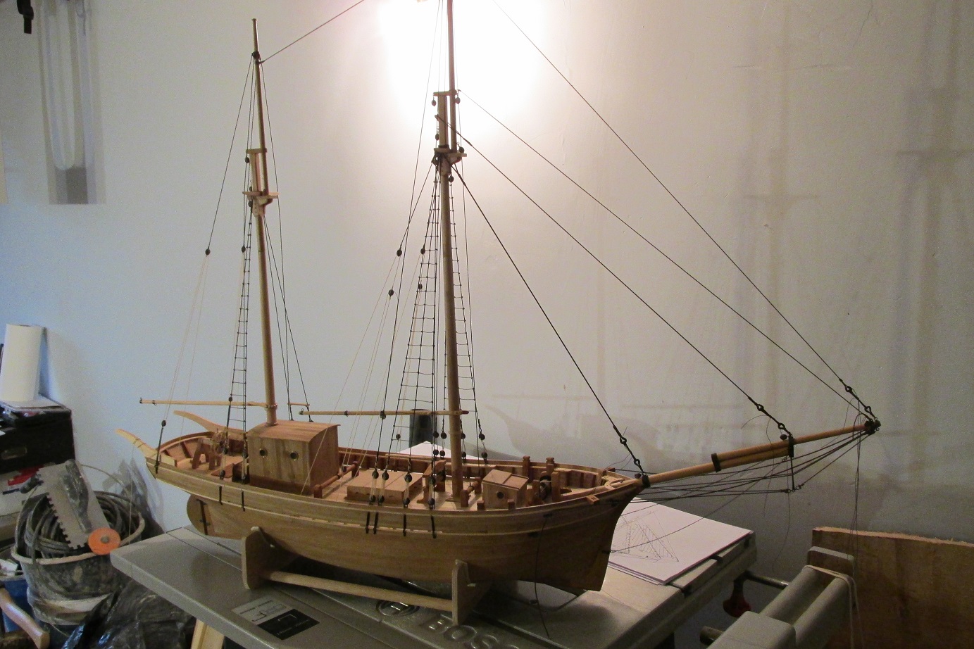 Kończę powoli olinowanie stałe. Kolejnym etapem będzie szalupa, w ramach odpoczynku od linek. Ponieważ nie zdawałem sobie sprawy jak dużo liny trzeba zużyć żeby coś powiązać, ropewalk chodzi prawie na okrągło.Liny grotmaszt - bukszpryt na razie tylko związane bez podklejenia i odcinania owijek, to tak na wszelki wypadek, na ostatni etap naciągania.